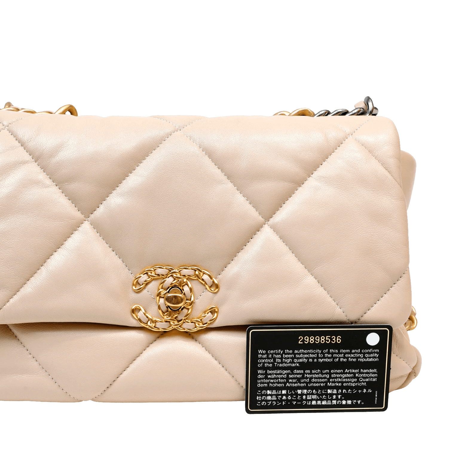 This authentic Chanel Beige Lambskin 19 Bag is in pristine unworn condition.  Released in 2019, the pillowy soft oversized quilts and mixed metals are a beautiful addition to the classic flap family.  Neutral beige lambskin is quilted in signature Chanel pattern on a larger scale.  Interlocking CC twist lock with gold chain detail secures the front flap.  Mixed metal chain straps in silver, ruthenium and aged gold allow for hand or shoulder carry.  Fabric lined interior.  Chanel authenticity card, intact hologram and dust bag included.