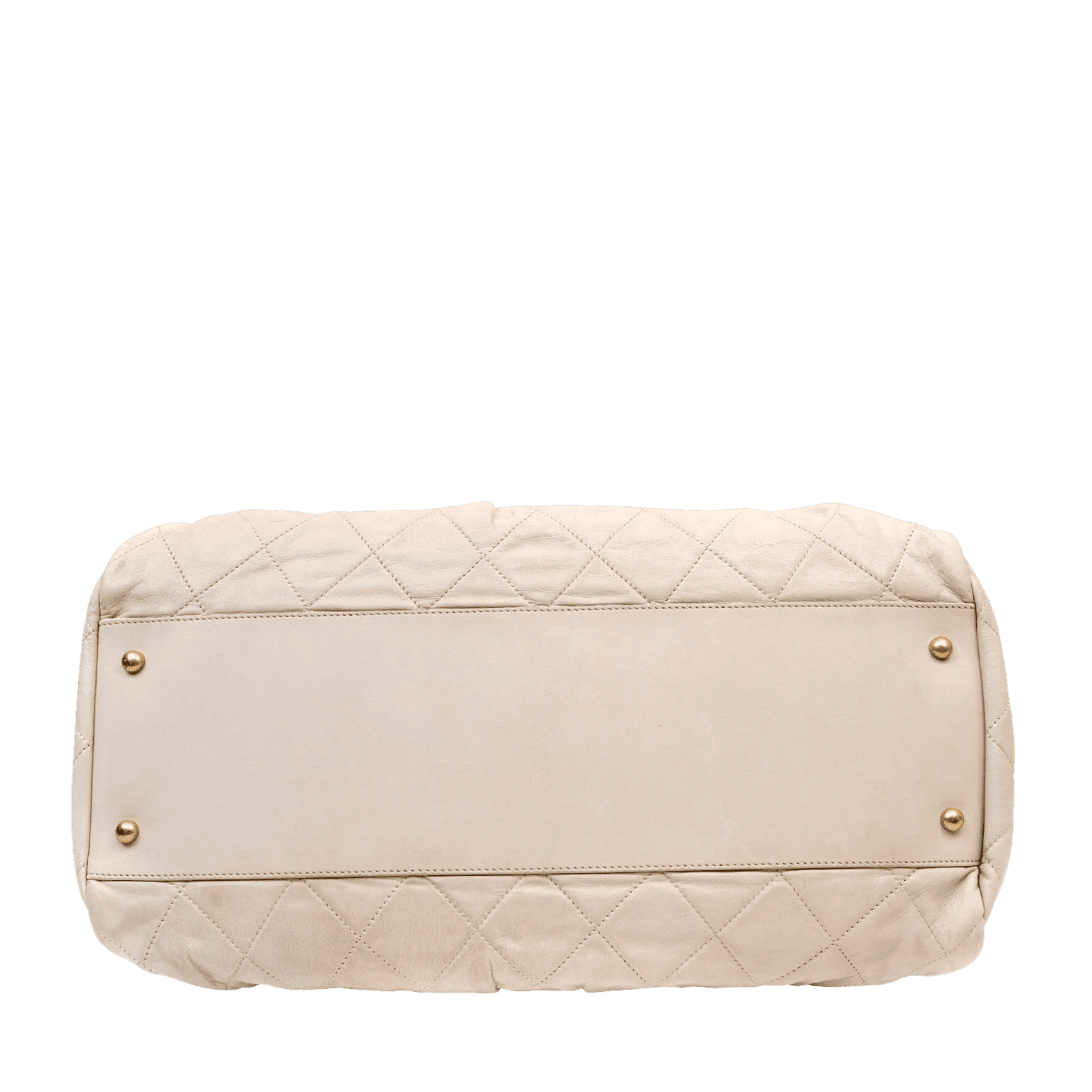 This authentic Chanel Beige Quilted Lambskin Day Tote is in excellent condition.  Perfectly scaled for daily enjoyment and neutral coloring to match any ensemble.