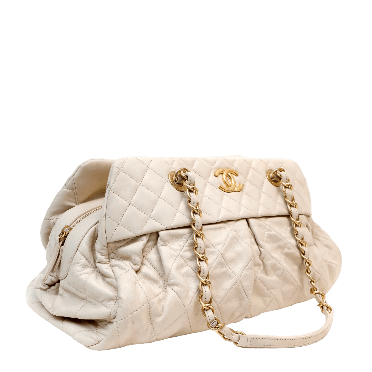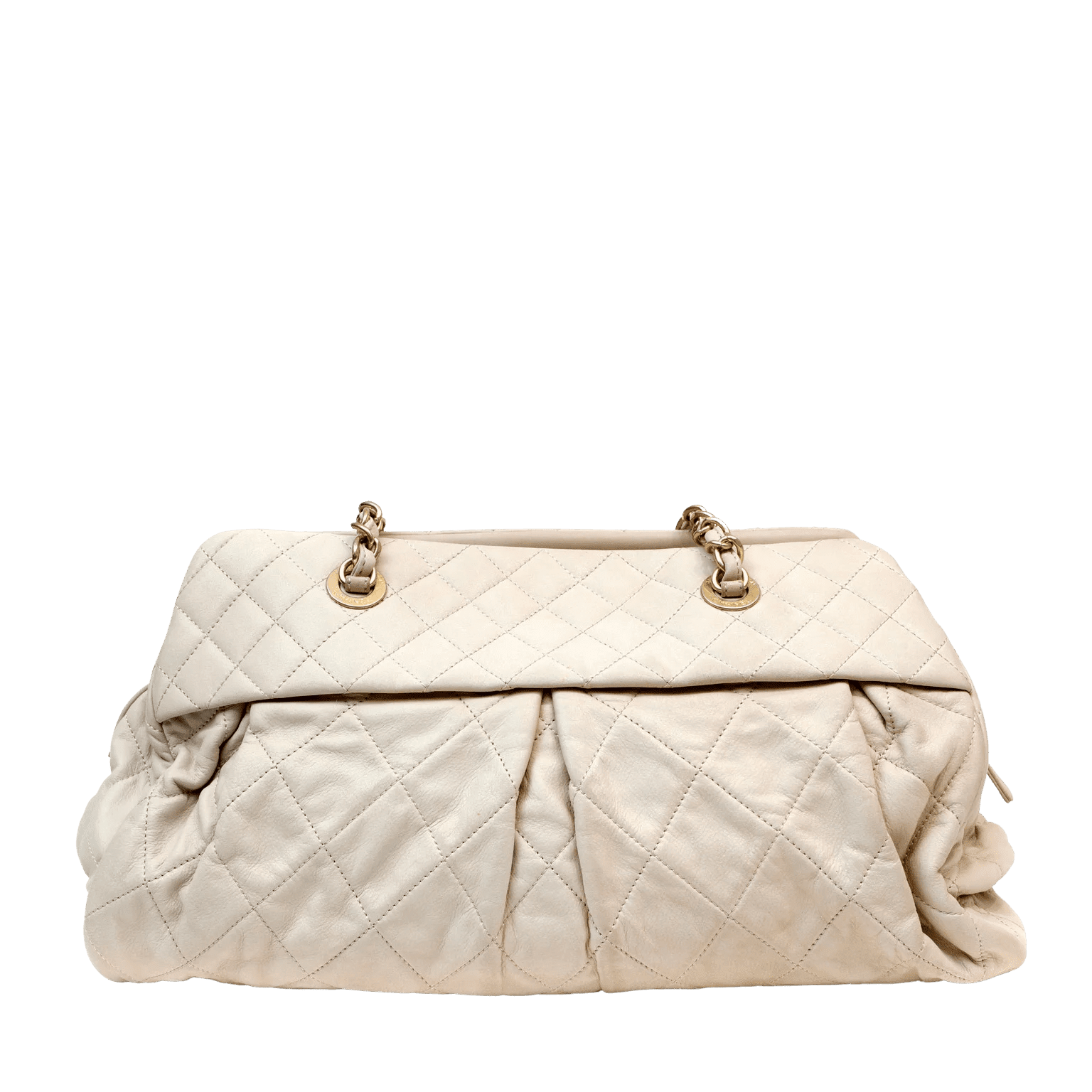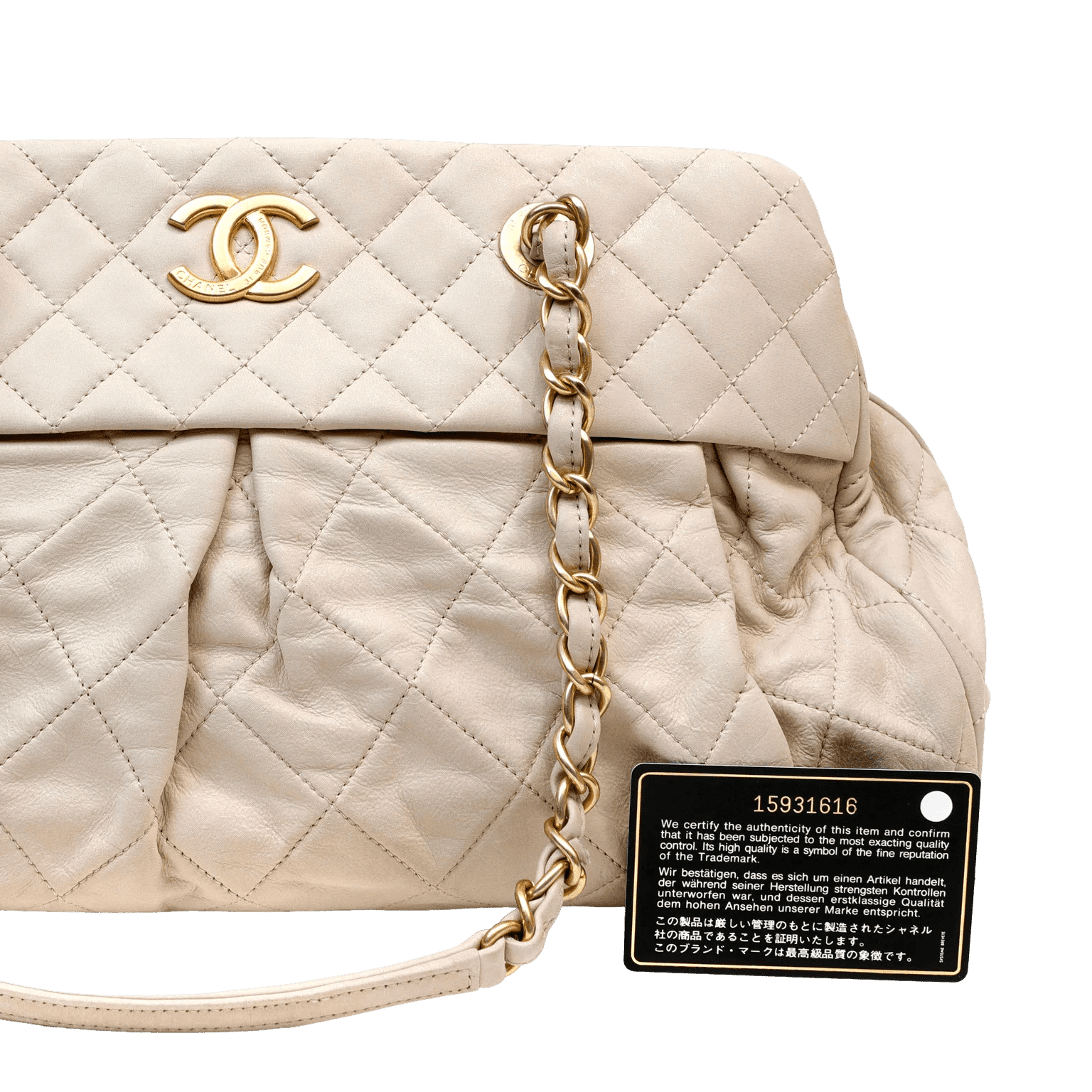 Soft beige lambskin is topstitched in signature Chanel diamond pattern.  Feminine pleats add dimension.  Matte gold hardware accents.  Double straps may be carried snugly on the shoulder.  Chanel authenticity card, intact hologram and dust bag included.
