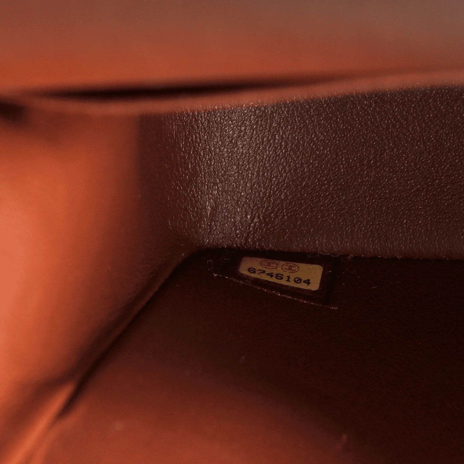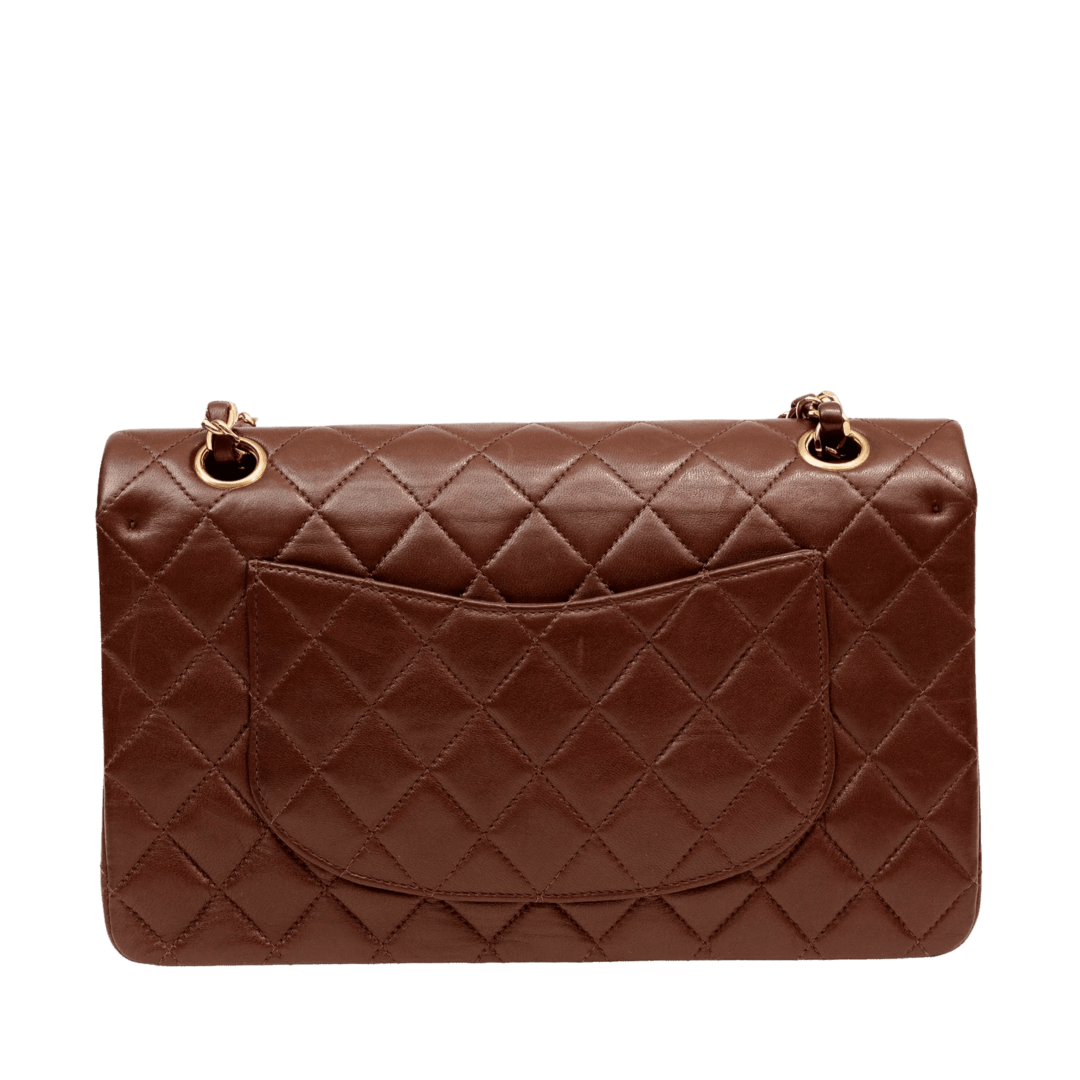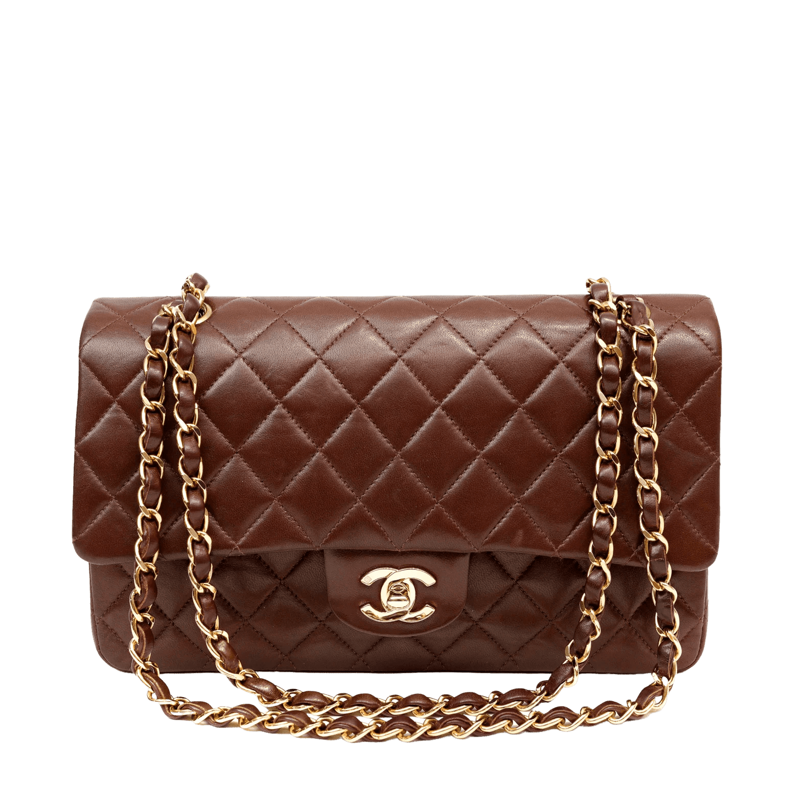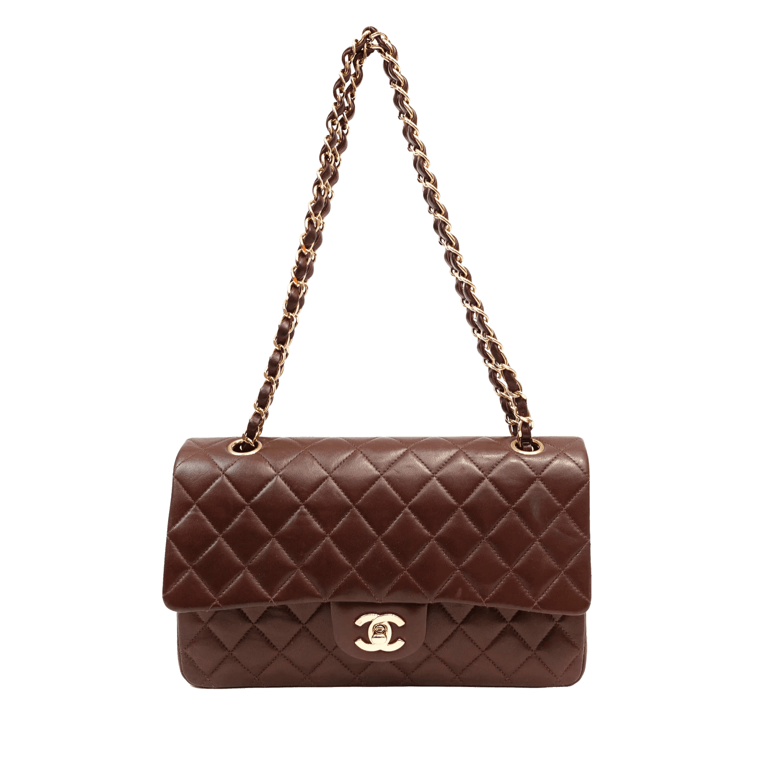 Rich chocolate brown lambskin is quilted in signature Chanel diamond pattern. Gold interlocking CC twist lock secures the front flap. Simple press snap secures the interior flap. Leather lining. Leather and chain entwined strap may be carried single or double. Dust bag included.