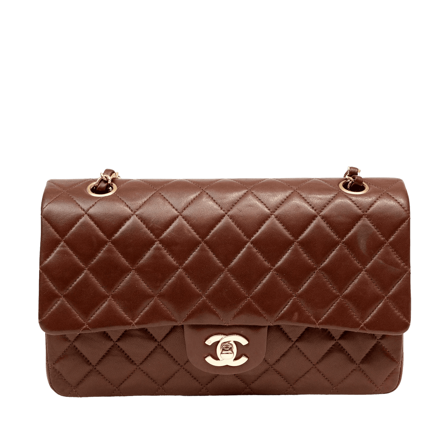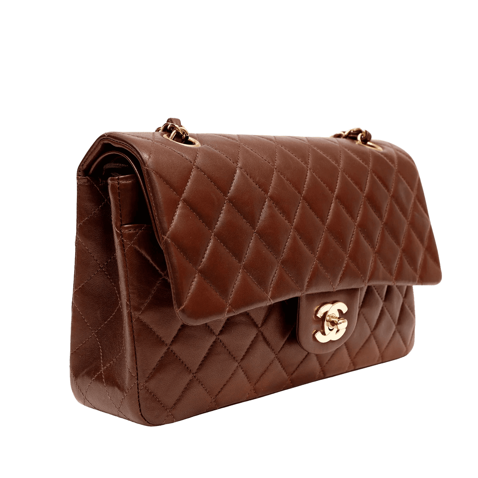 This authentic Chanel Brown Lambskin Medium Classic Double Flap Bag is in pristine condition. Most commonly seen in black, this rare chocolate brown version is exquisite and perfectly scaled in the medium silhouette.