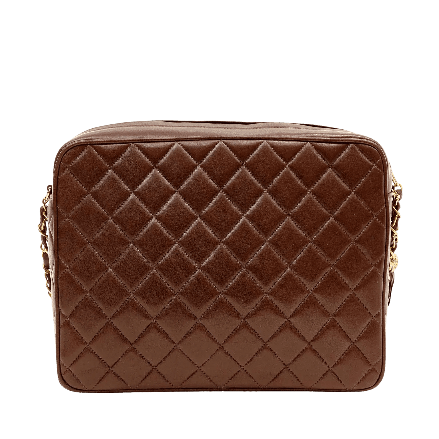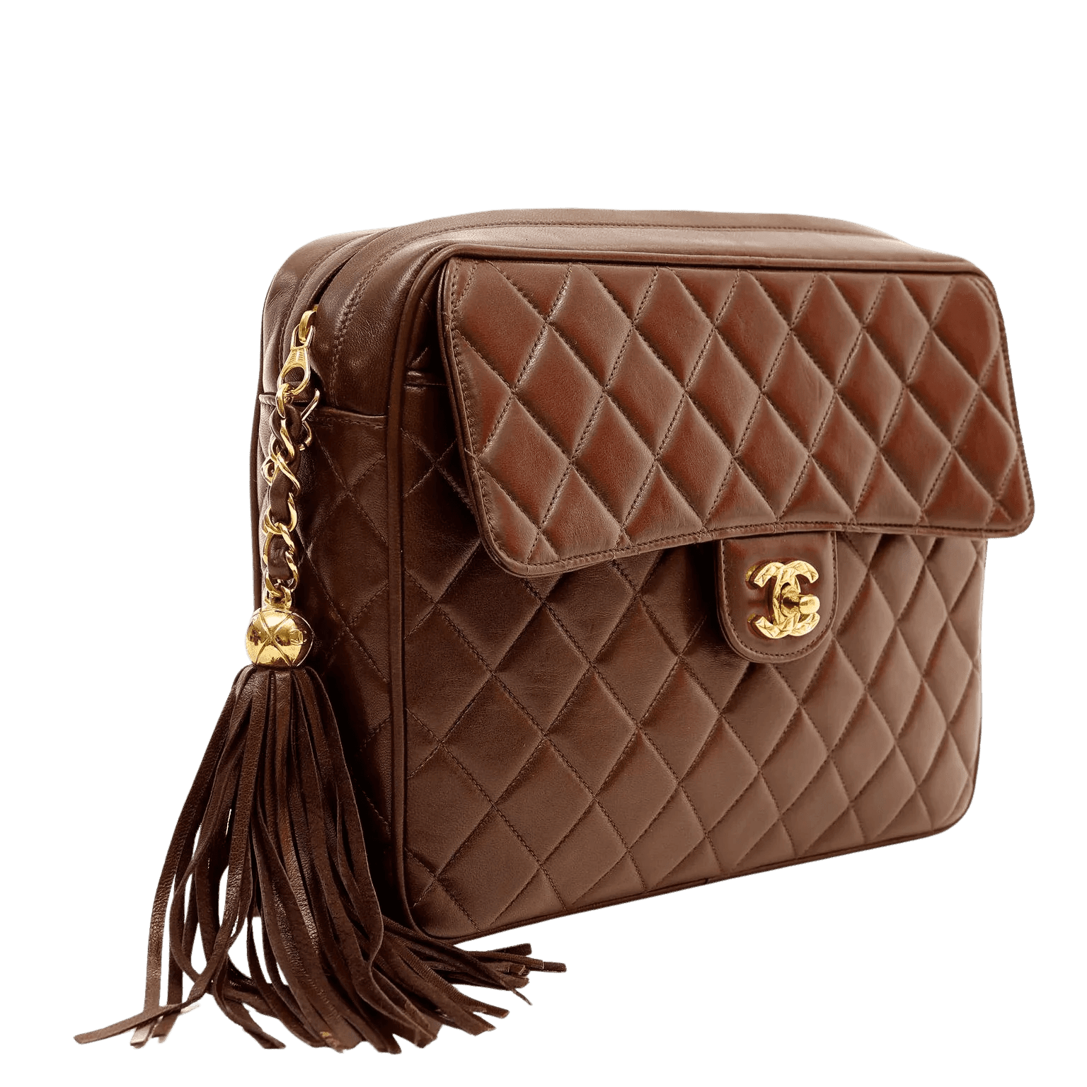 This authentic Chanel Brown Lambskin Vintage Camera Bag is in excellent plus condition. A beautiful timeless classic, this is a must have for any collection. Rich chocolate brown lambskin is quilted in signature Chanel diamond pattern. Gold interlocking CC secures a front flap. Top zipper closure with colossal leather tassel pull. Single leather and chain entwined strap. Chanel authenticity card, intact hologram and dust bag included.