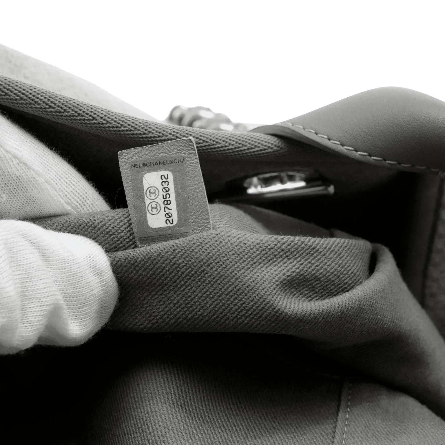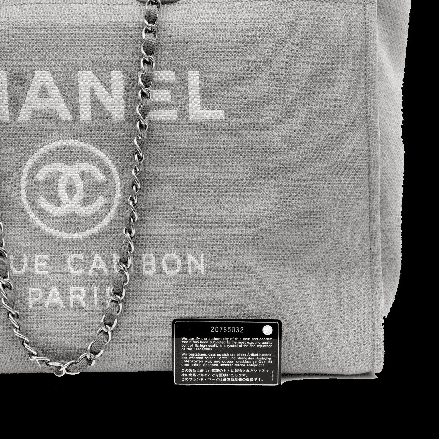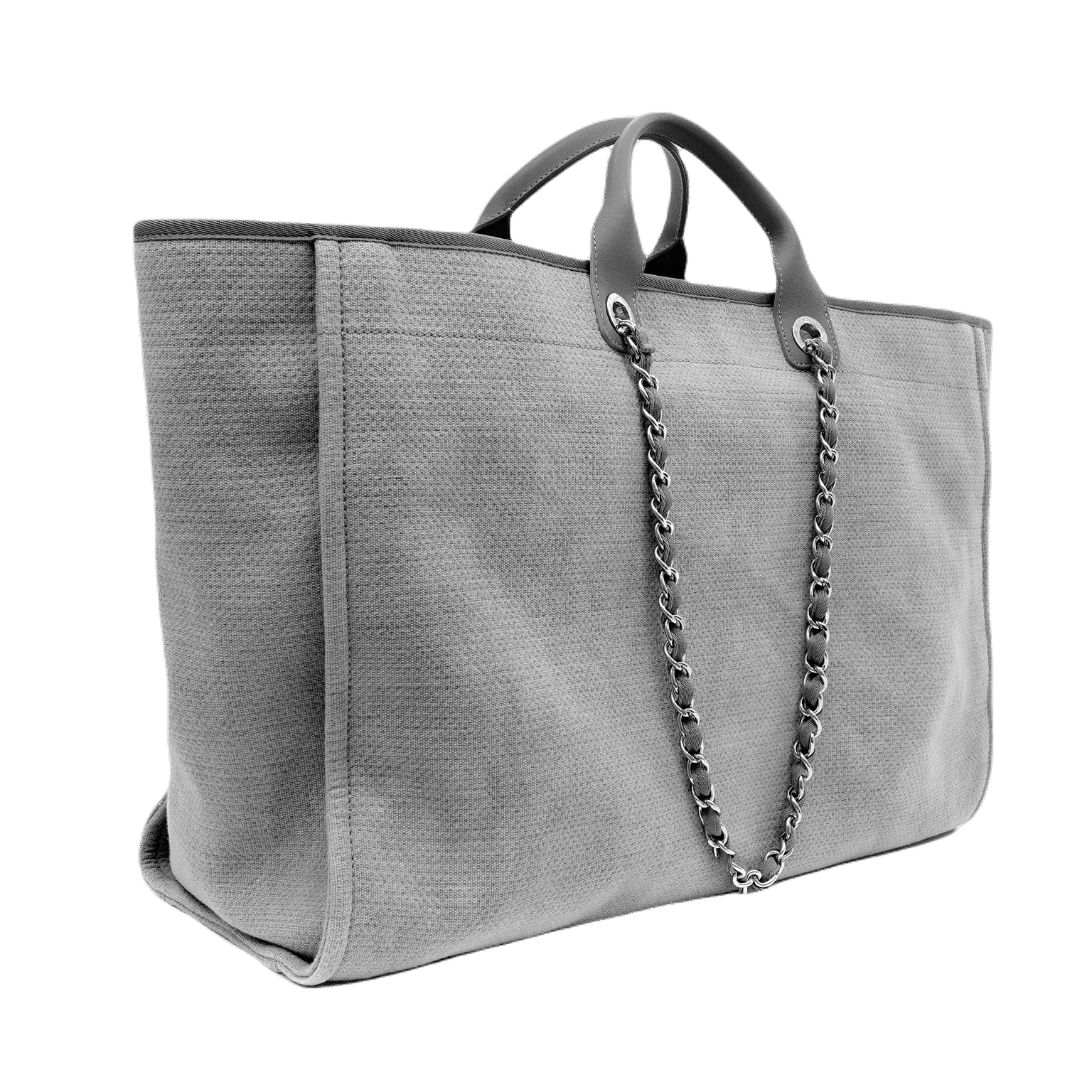 Dark grey fabric tote is extra large and roomy.  Silver stitching and hardware.  Carried by the leather top handles or the fabric and chain entwined shoulder straps.   Chanel authenticity card, intact hologram and dust bag included.