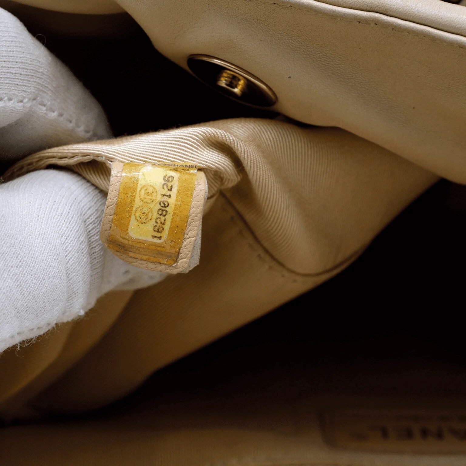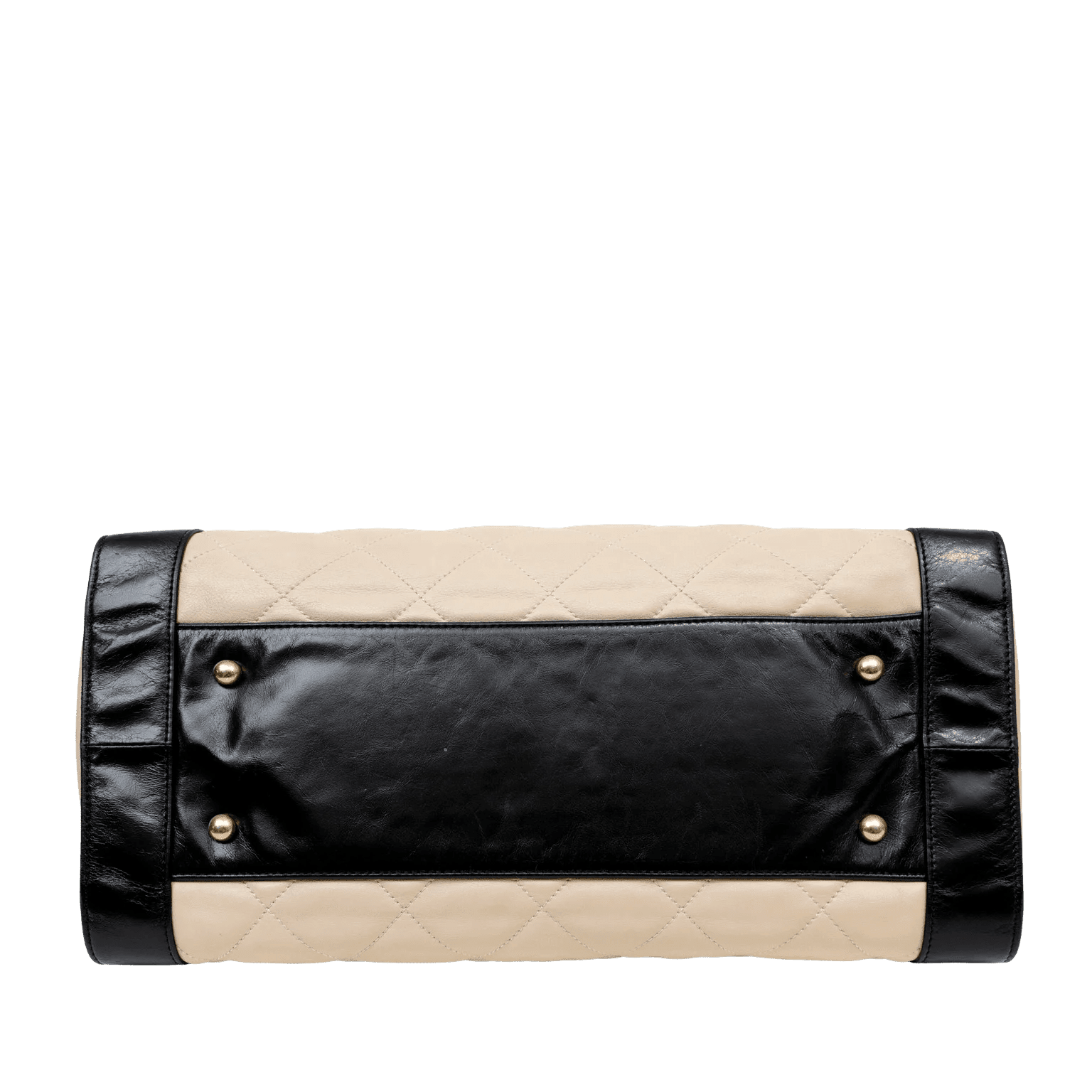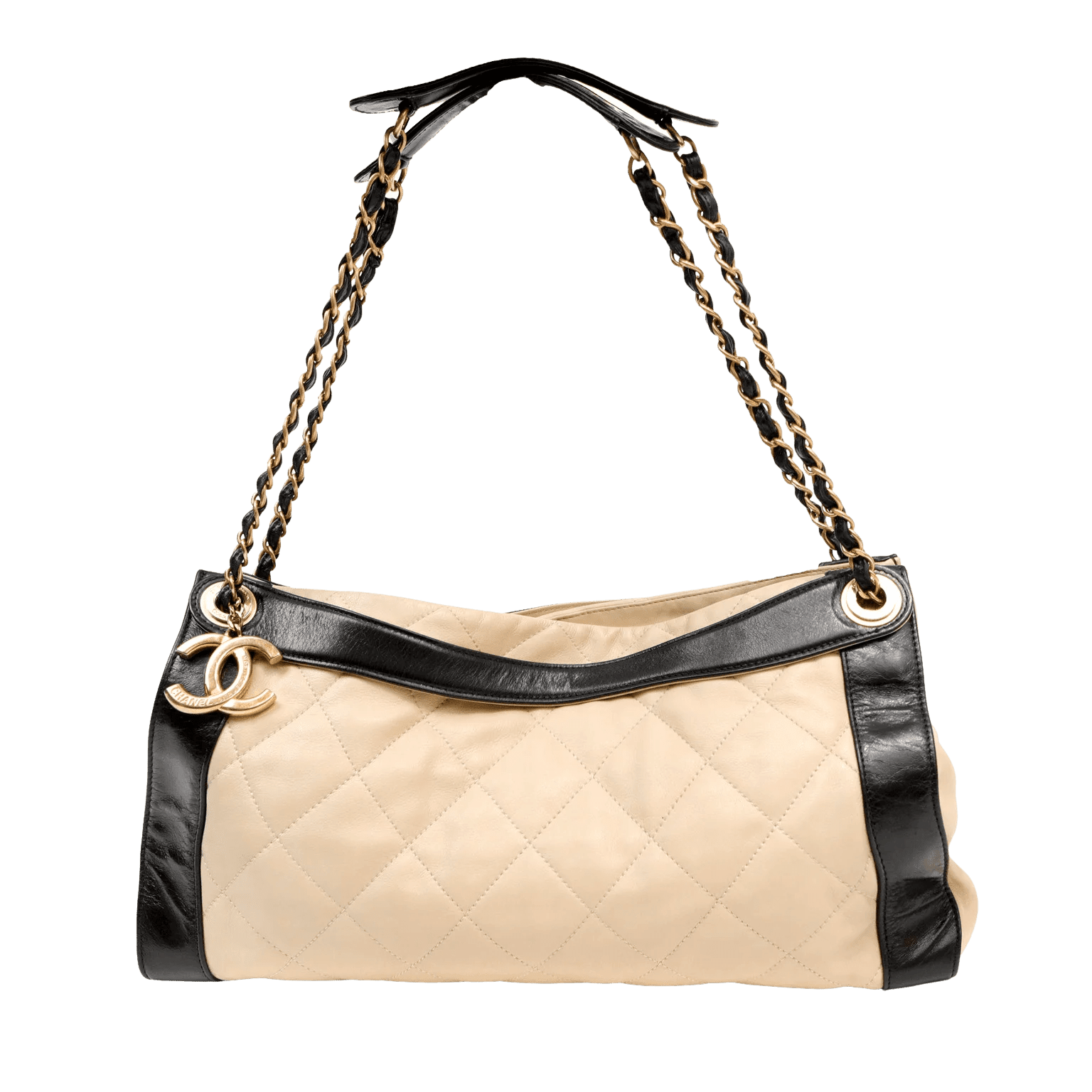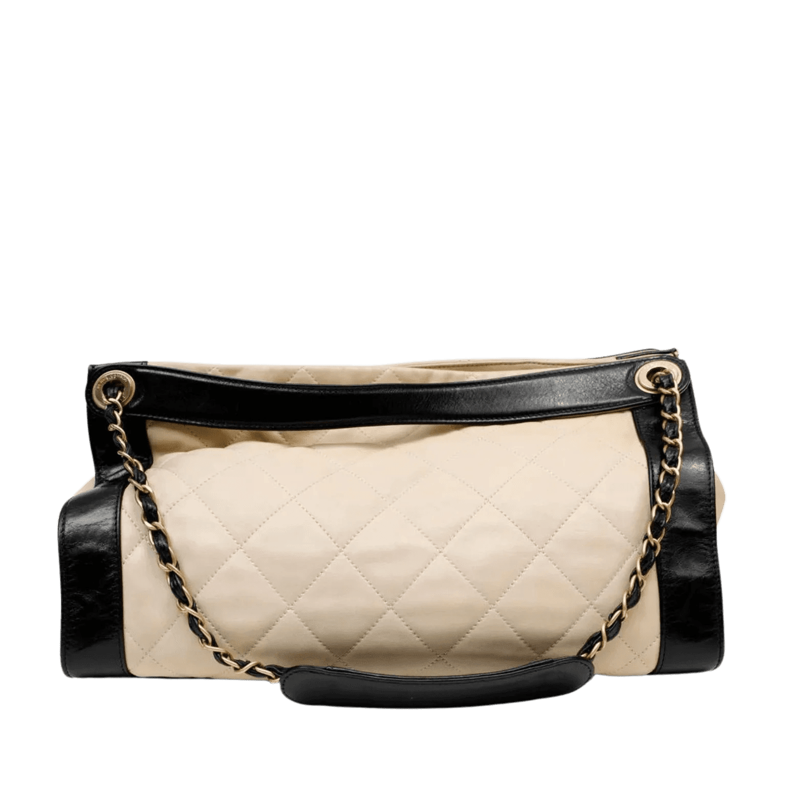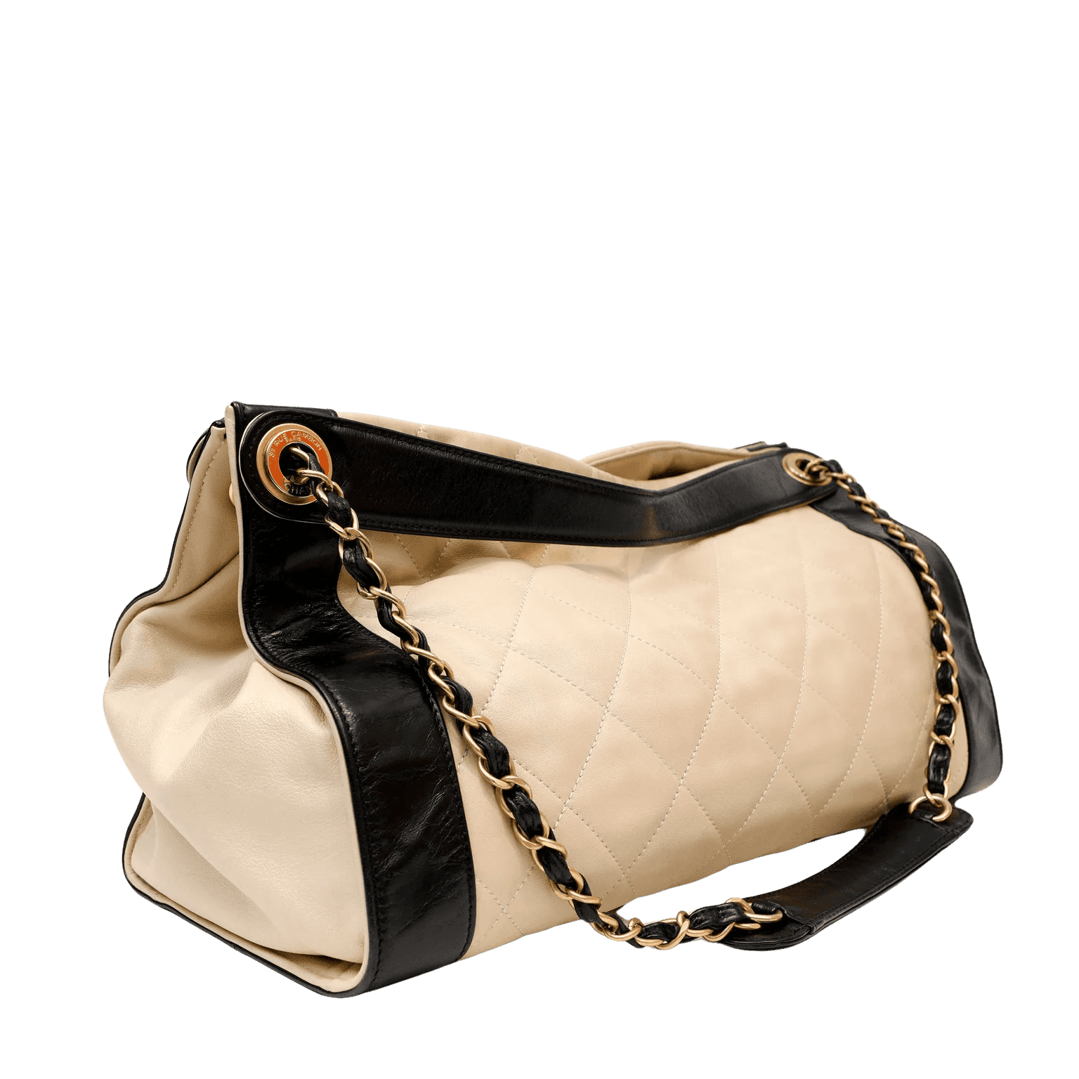 This authentic Chanel Ivory and Black Quilted Leather Tote is in excellent condition. Perfect for everyday use, this understated chic tote is certain to become a wardrobe favorite. Ivory leather tote is quilted in signature Chanel diamond pattern. Smooth black leather reinforced framed edges. Leather and chain entwined double straps are comfortably carried on the shoulder. Made in Italy. Dust bag included.