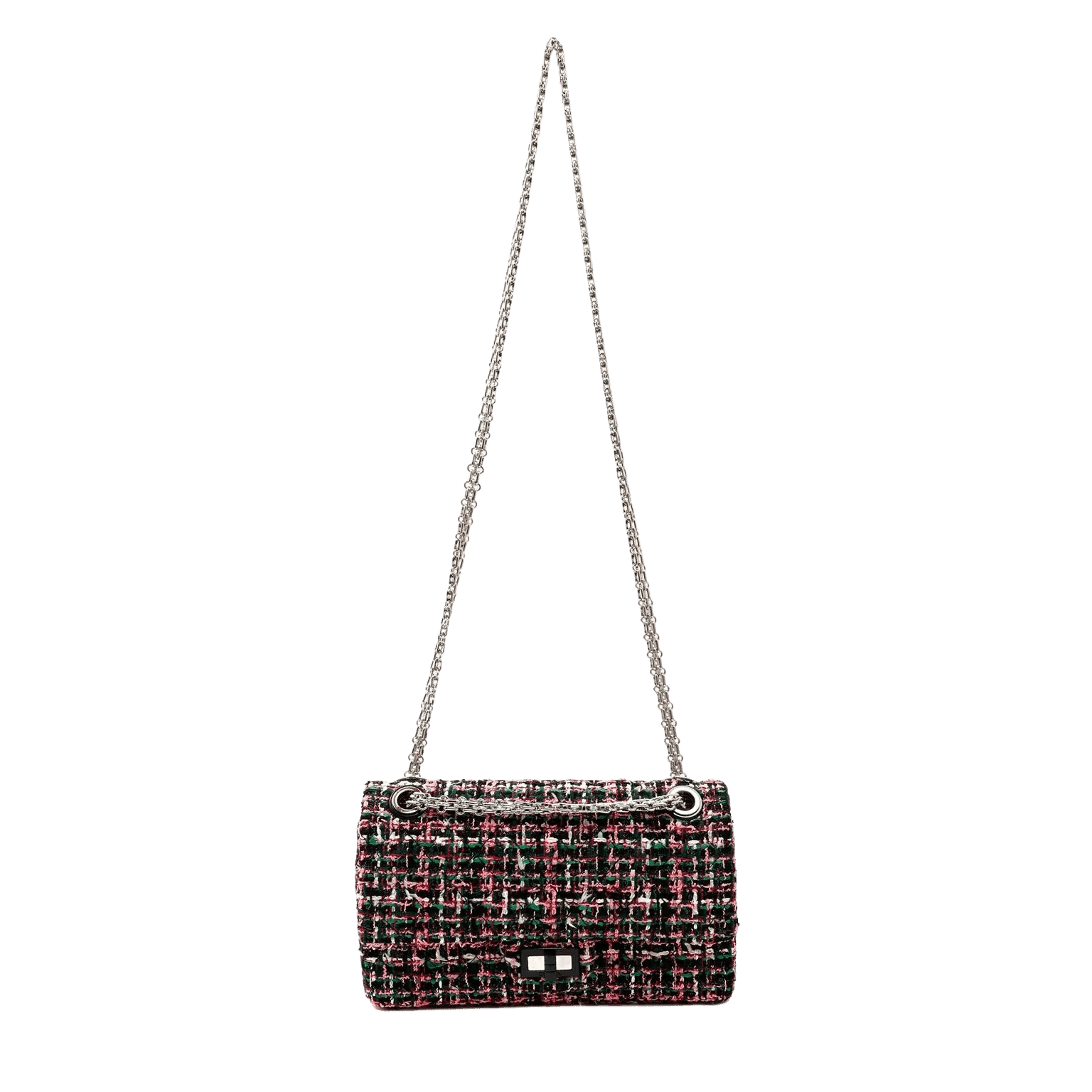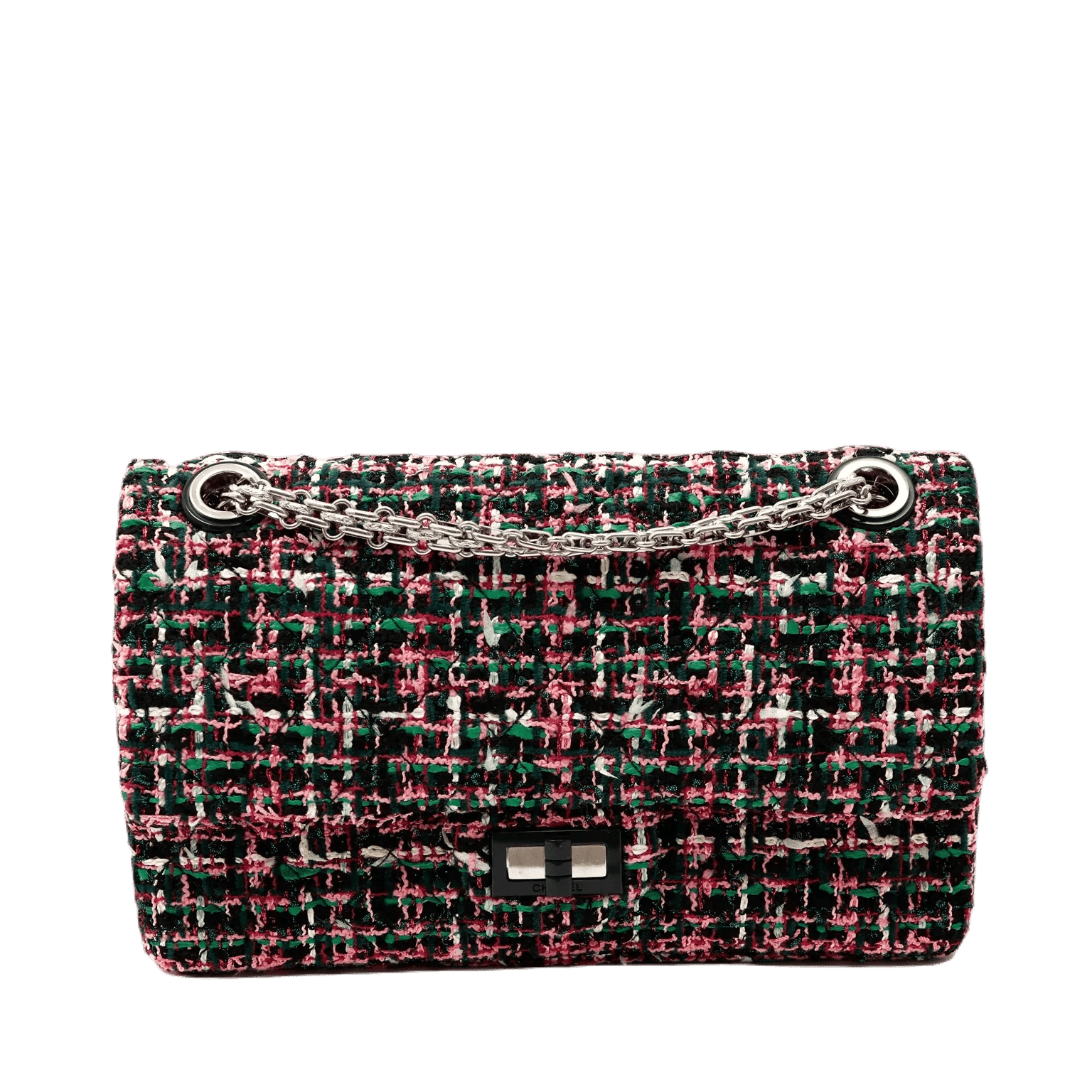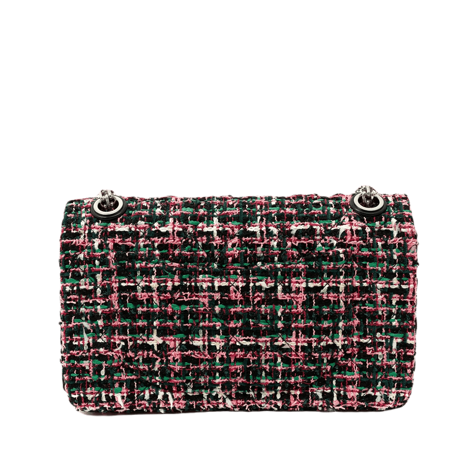 Black, green and pink tweed fabric is quilted in signature Chanel diamond pattern. Black lacquer and silver tone mademoiselle twist lock secures the exterior flap. Black leather interior with simple press snap on interior flap. Silver bijoux style chain strap may be carried single or double. Chanel authenticity card, intact hologram and dust bag included.