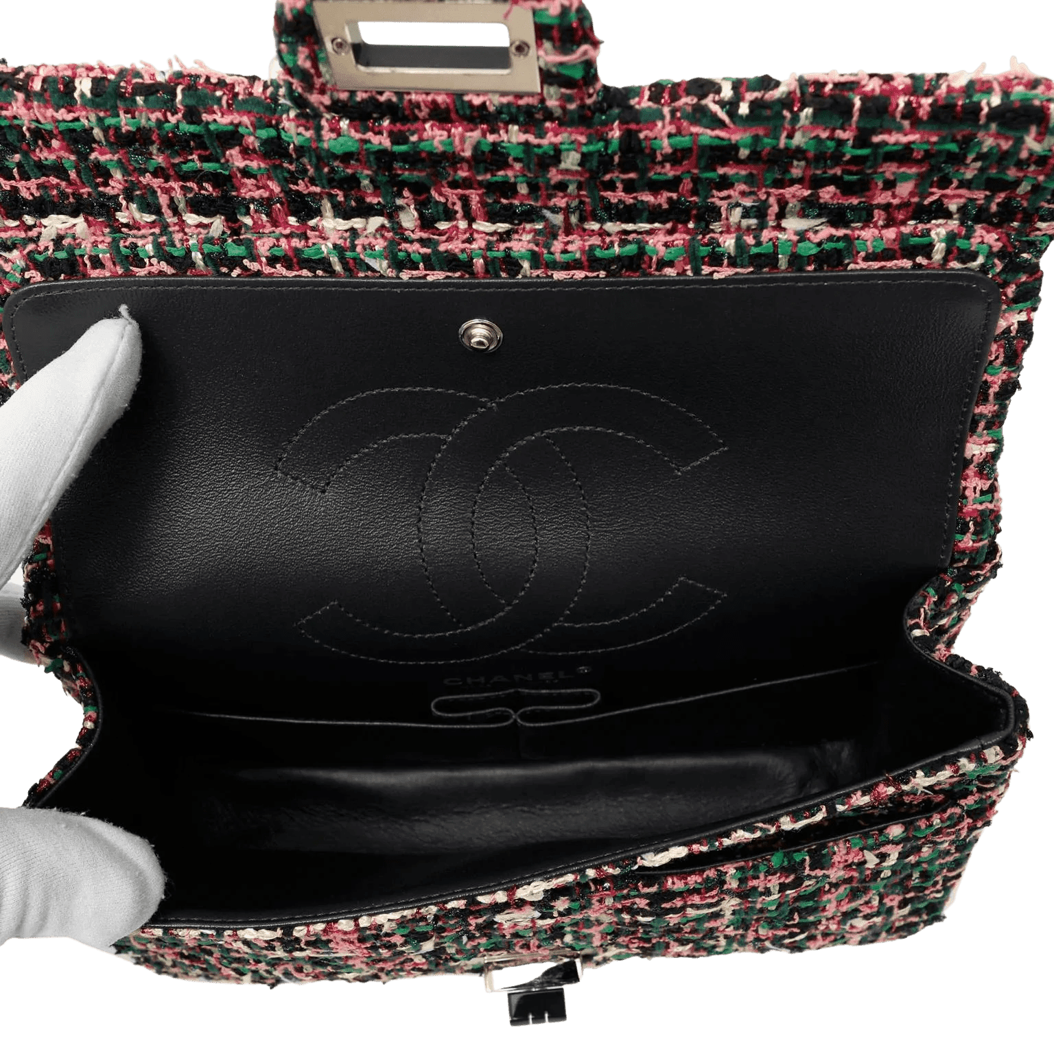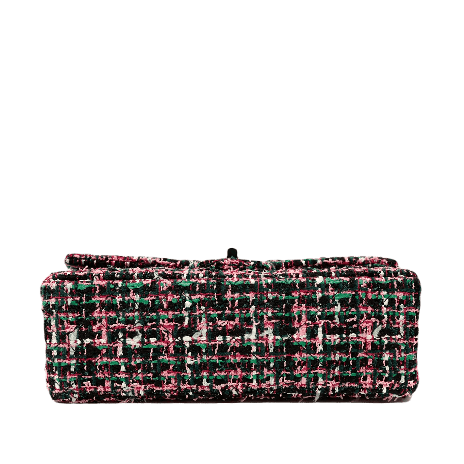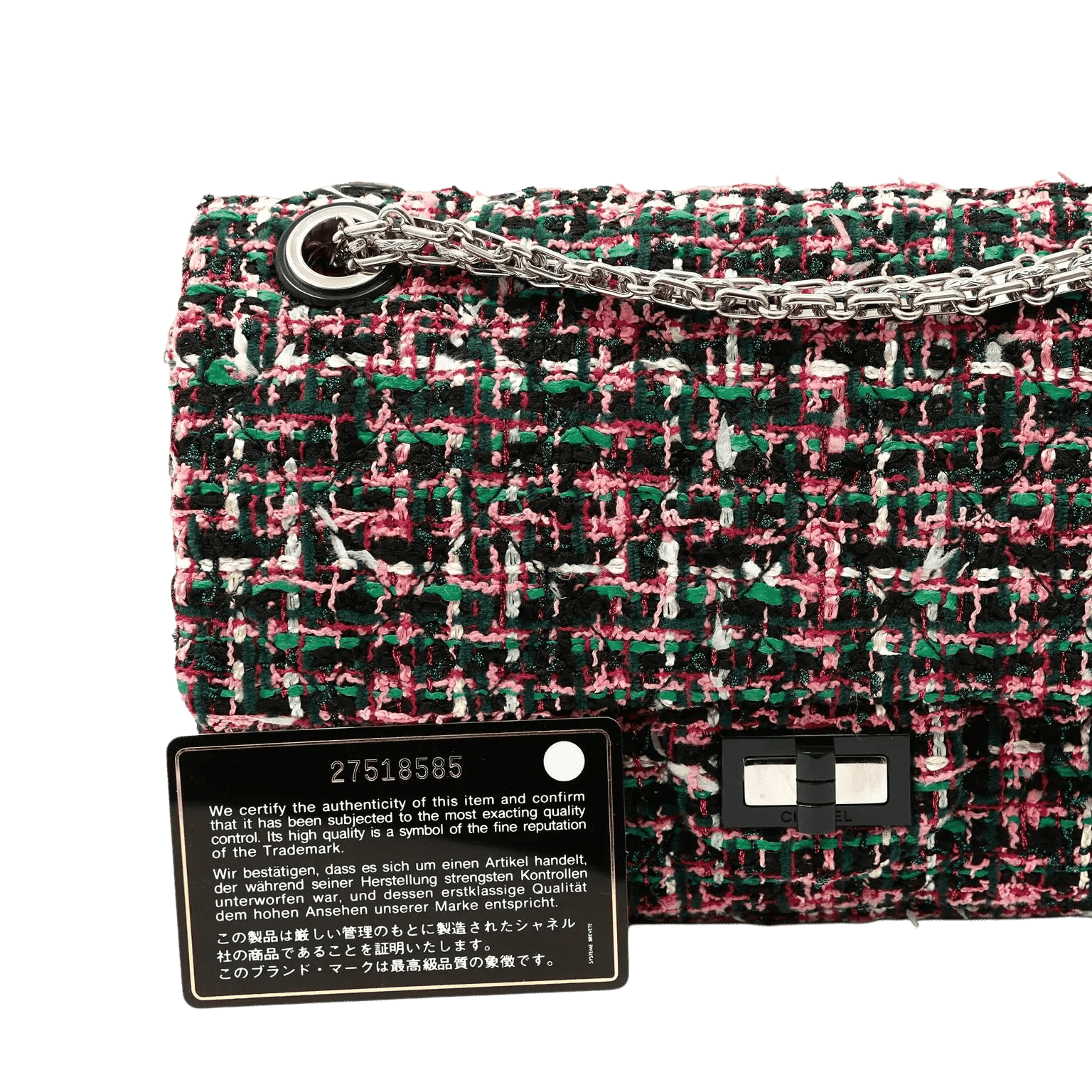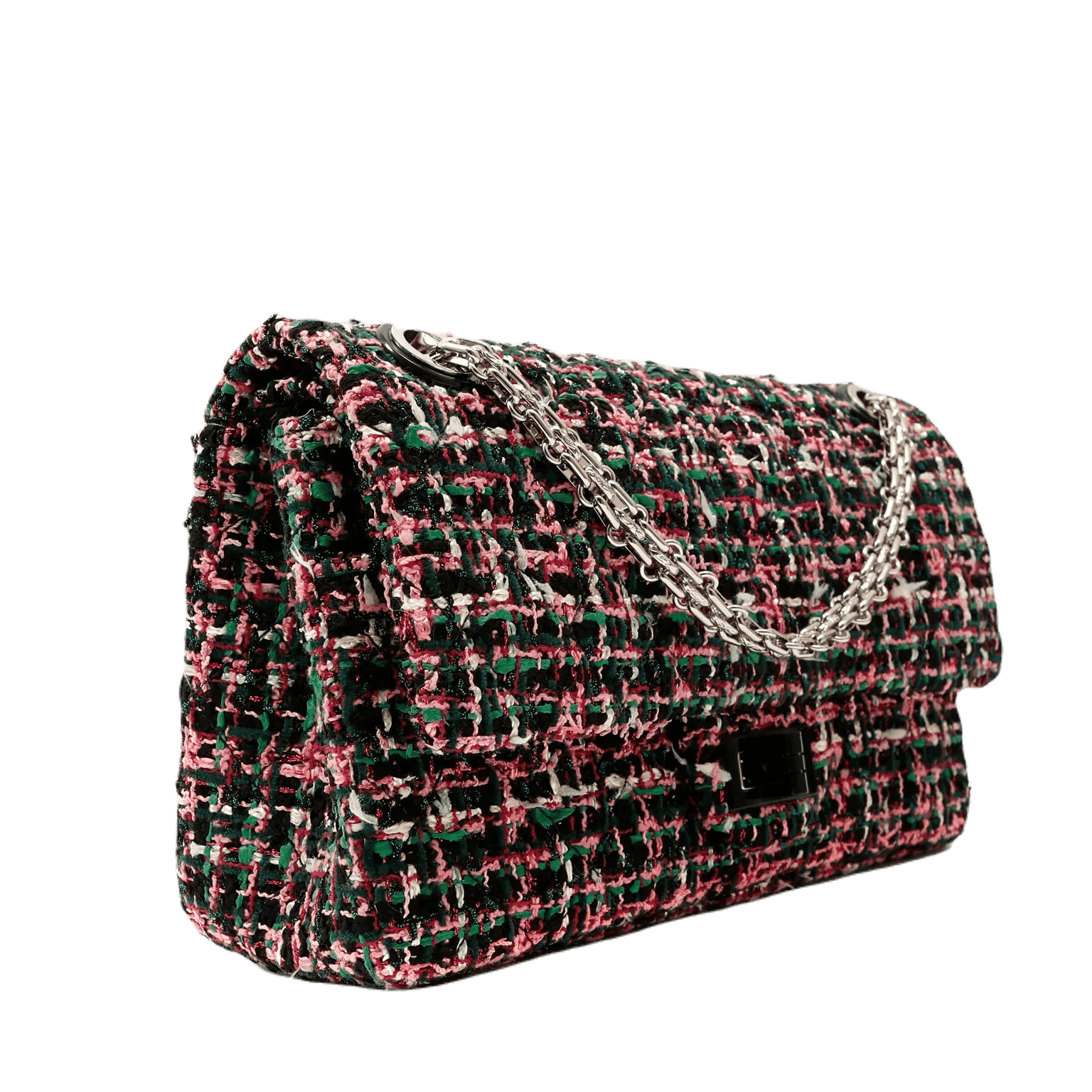 Black, green and pink tweed fabric is quilted in signature Chanel diamond pattern. Black lacquer and silver tone mademoiselle twist lock secures the exterior flap. Black leather interior with simple press snap on interior flap. Silver bijoux style chain strap may be carried single or double. Chanel authenticity card, intact hologram and dust bag included.