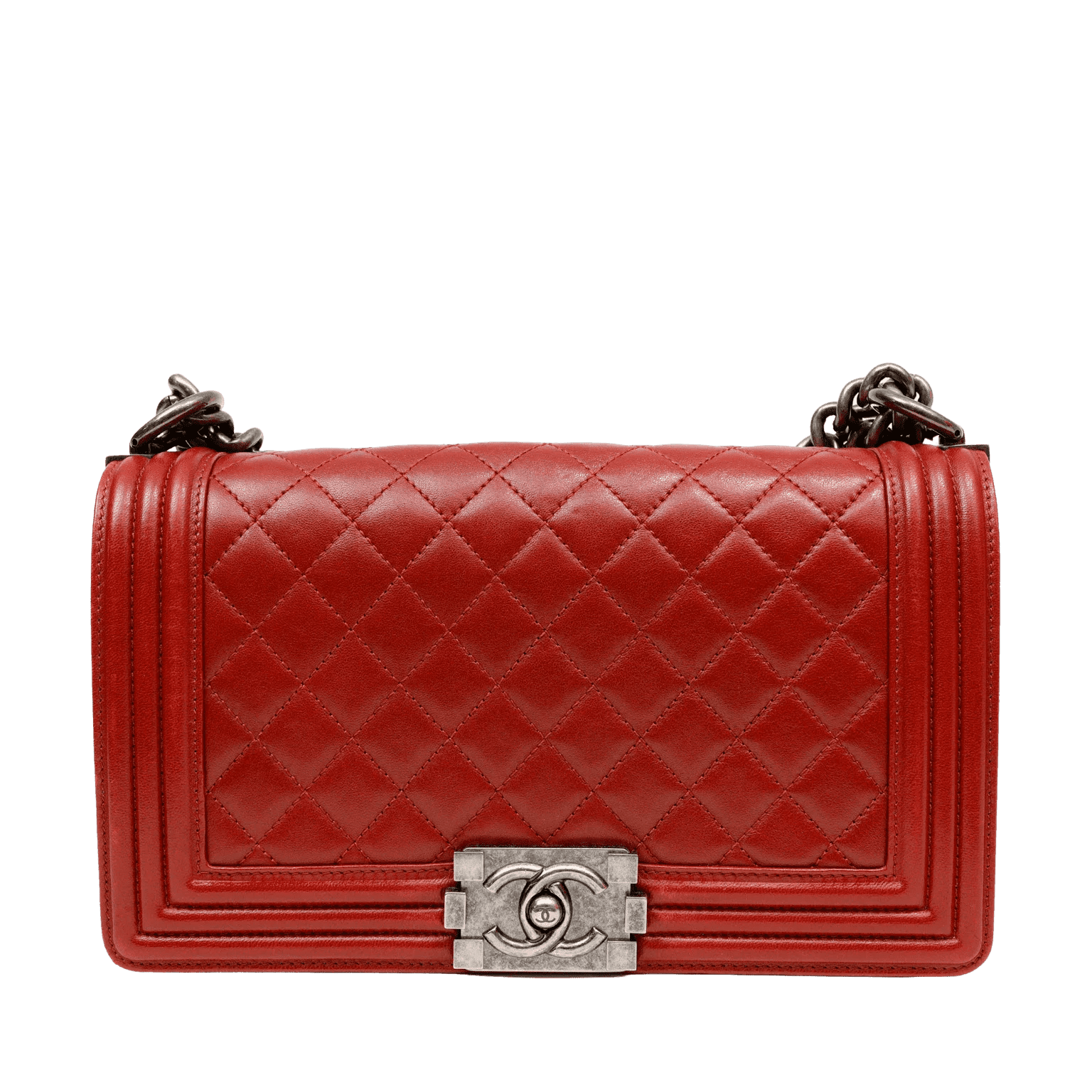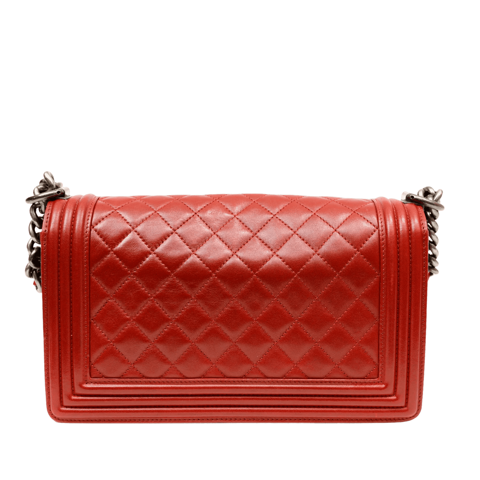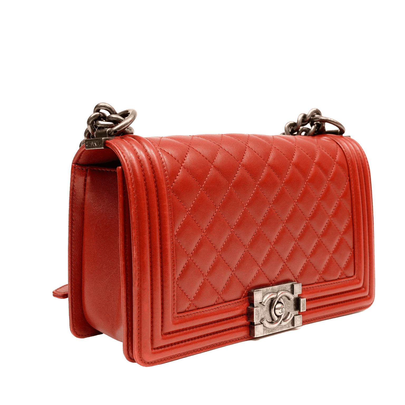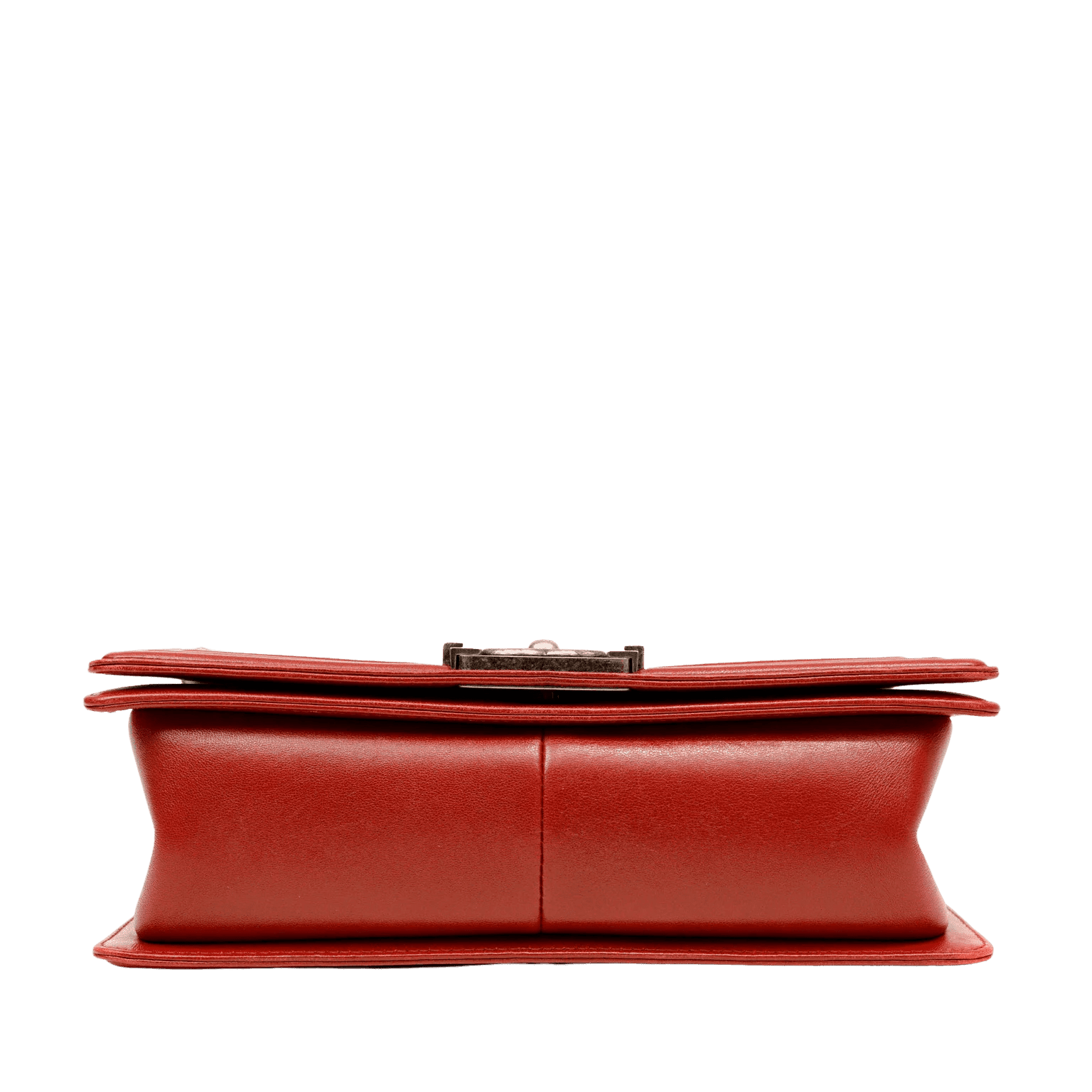 This authentic Chanel Red Calfskin Boy Bag is in pristine condition. The updated design is structured and edgy with a versatility that makes it extremely popular. True red calfskin is quilted in signature Chanel diamond stitched pattern. Boy Bag welted frame with Ruthenium signature push lock plaque closure. Substantial chain strap may be carried single, double, or cross the body. Dust bag included.