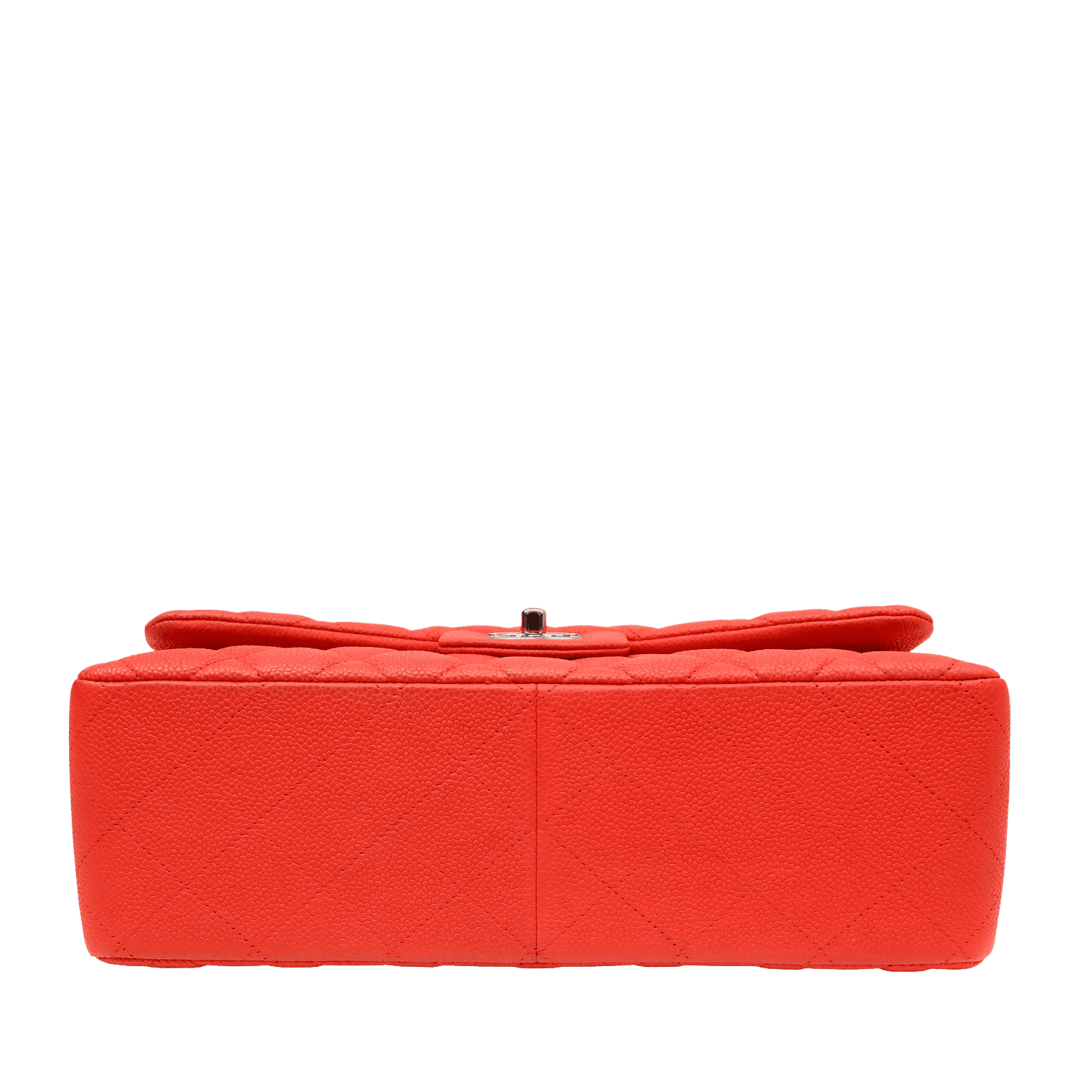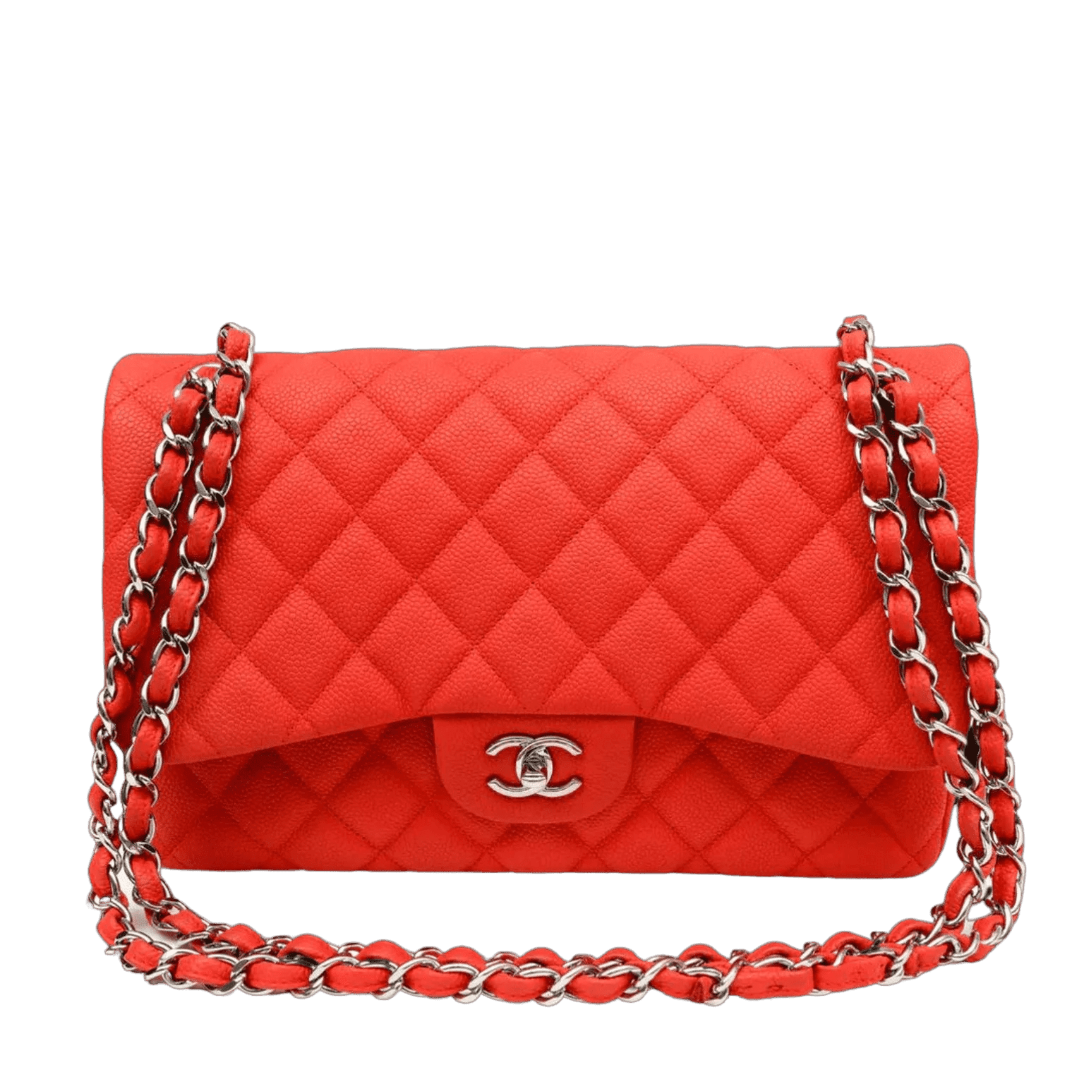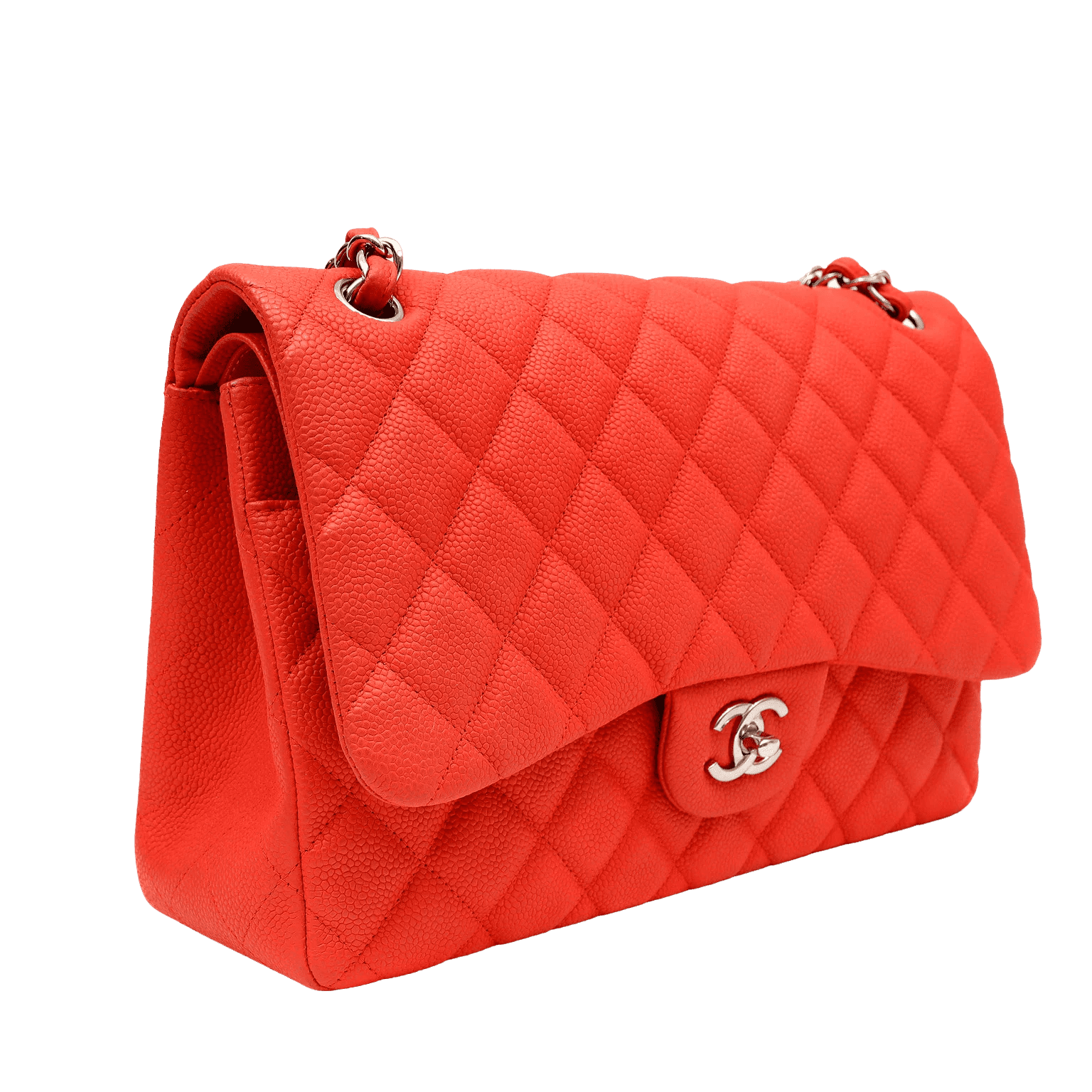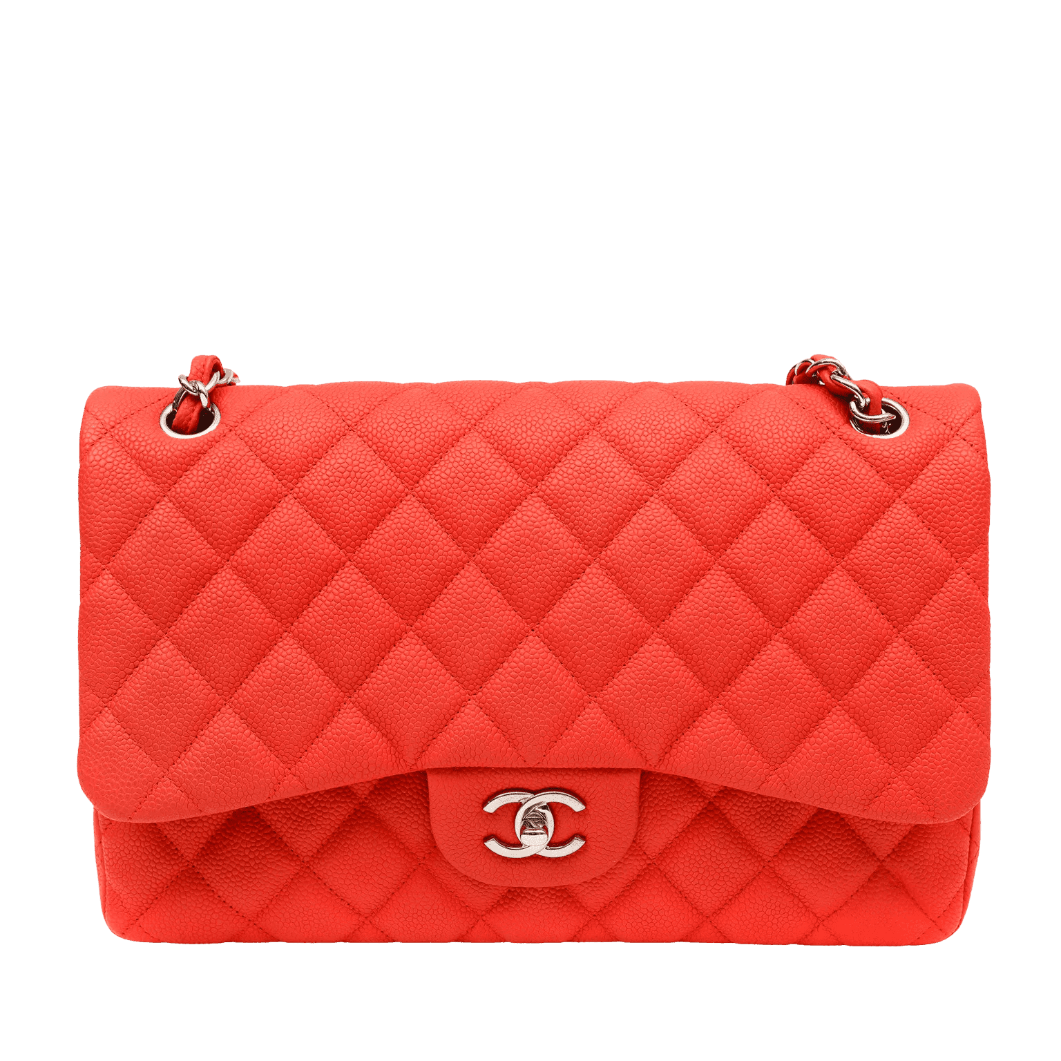 This authentic Chanel Salmon Brushed Caviar Jumbo Classic is in pristine condition. Durable and textured brushed salmon colored caviar leather is quilted in signature Chanel diamond pattern. Silver interlocking CC twist lock secures the exterior flap. Leather interior has a simple press snap on secondary flap. Elegant leather and chain entwined strap may be carried single or double. Chanel authenticity card, intact hologram and dust bag included.