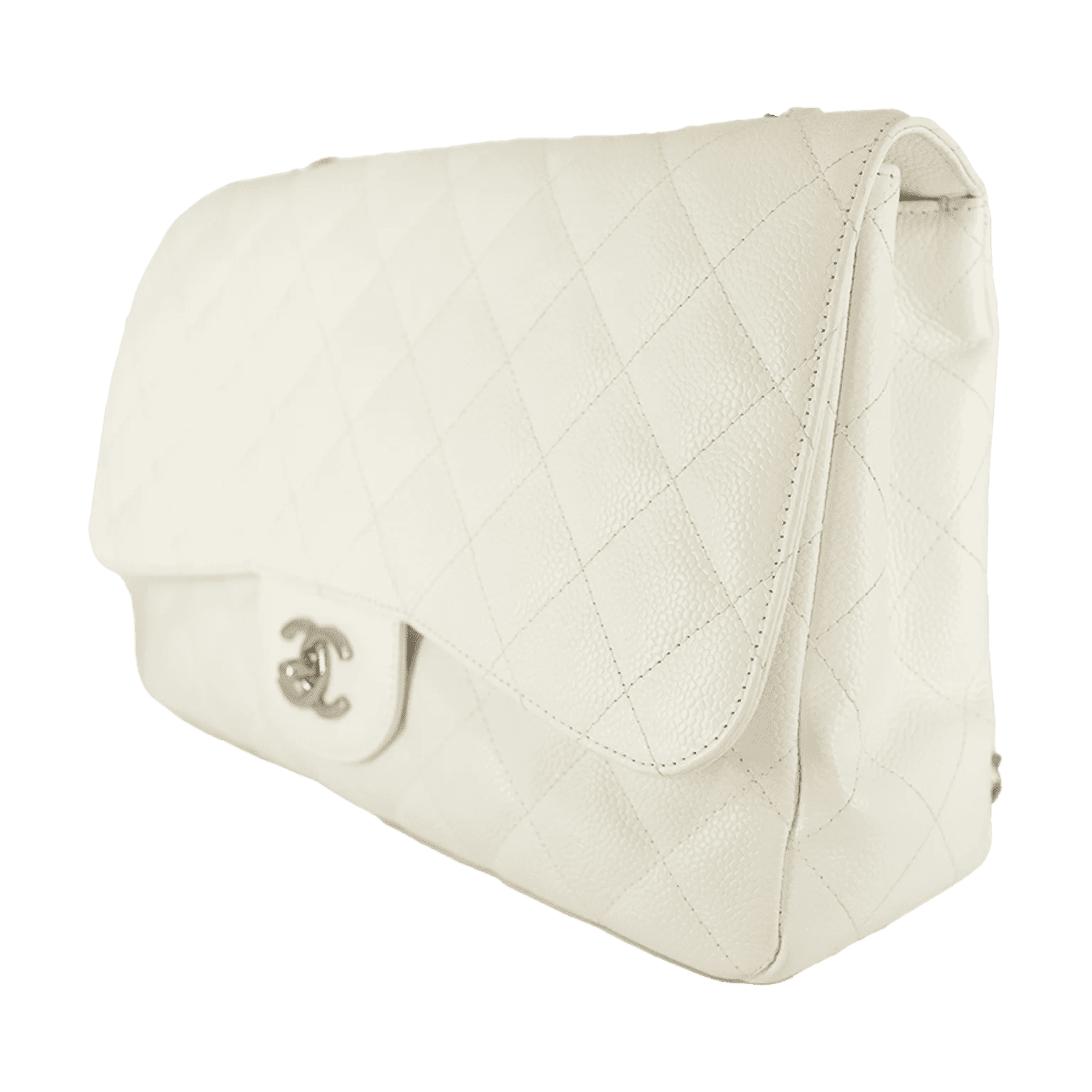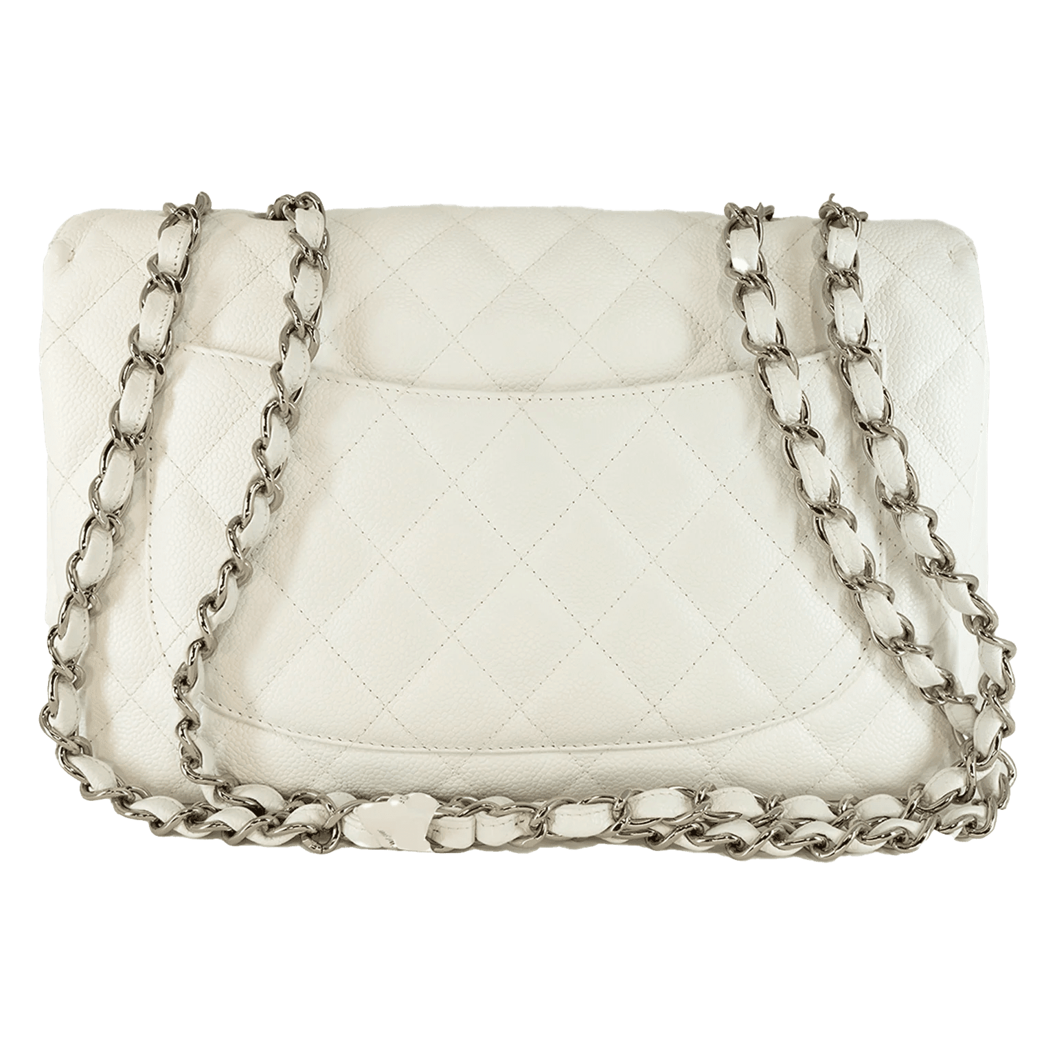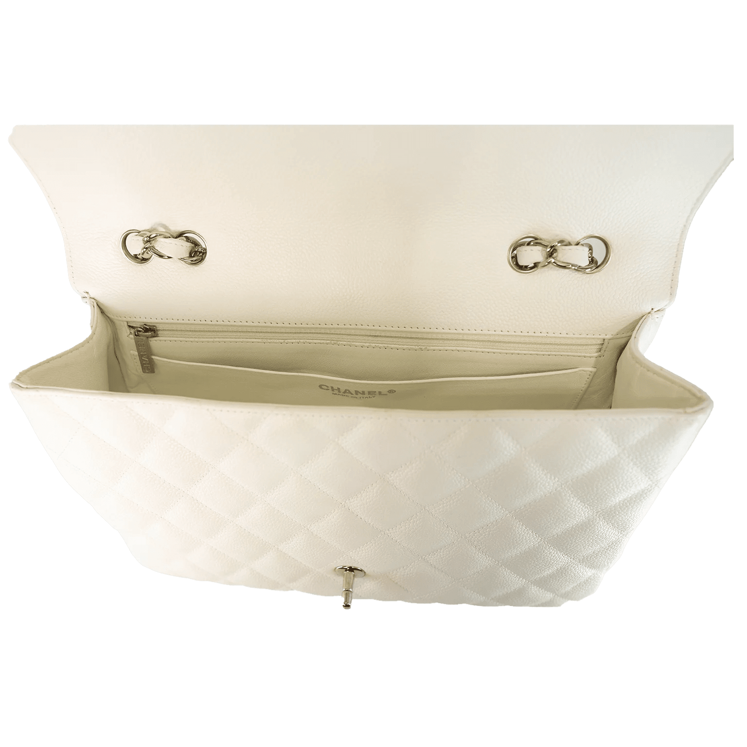 Durable and textured white Caviar leather is quilted in signature Chanel diamond pattern. Silver tone interlocking CC twist lock secures the exterior flap. White leather interior is extremely clean with side zipper and slip pockets. Leather and chain entwined strap may be carried single or double. Made in Italy. Intact hologram and dust bag included.
