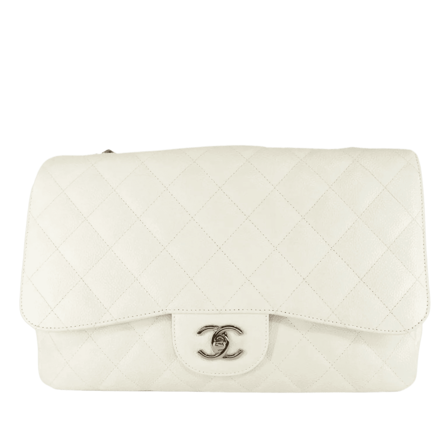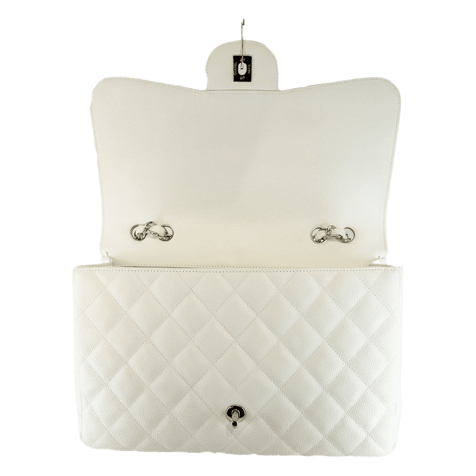 This authentic Chanel White Caviar Jumbo Classic Single Flap Bag is in excellent condition. A key piece in any sophisticated wardrobe, the Classic Flap is one of the most sought-after Chanel styles produced.
