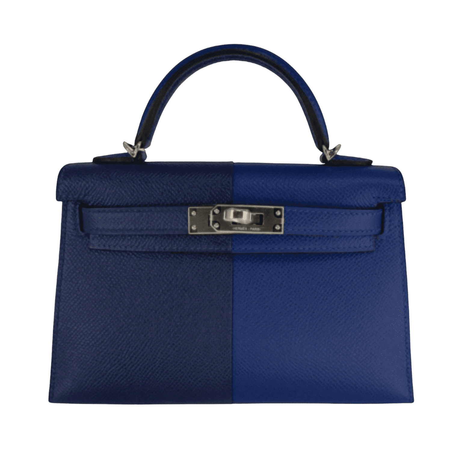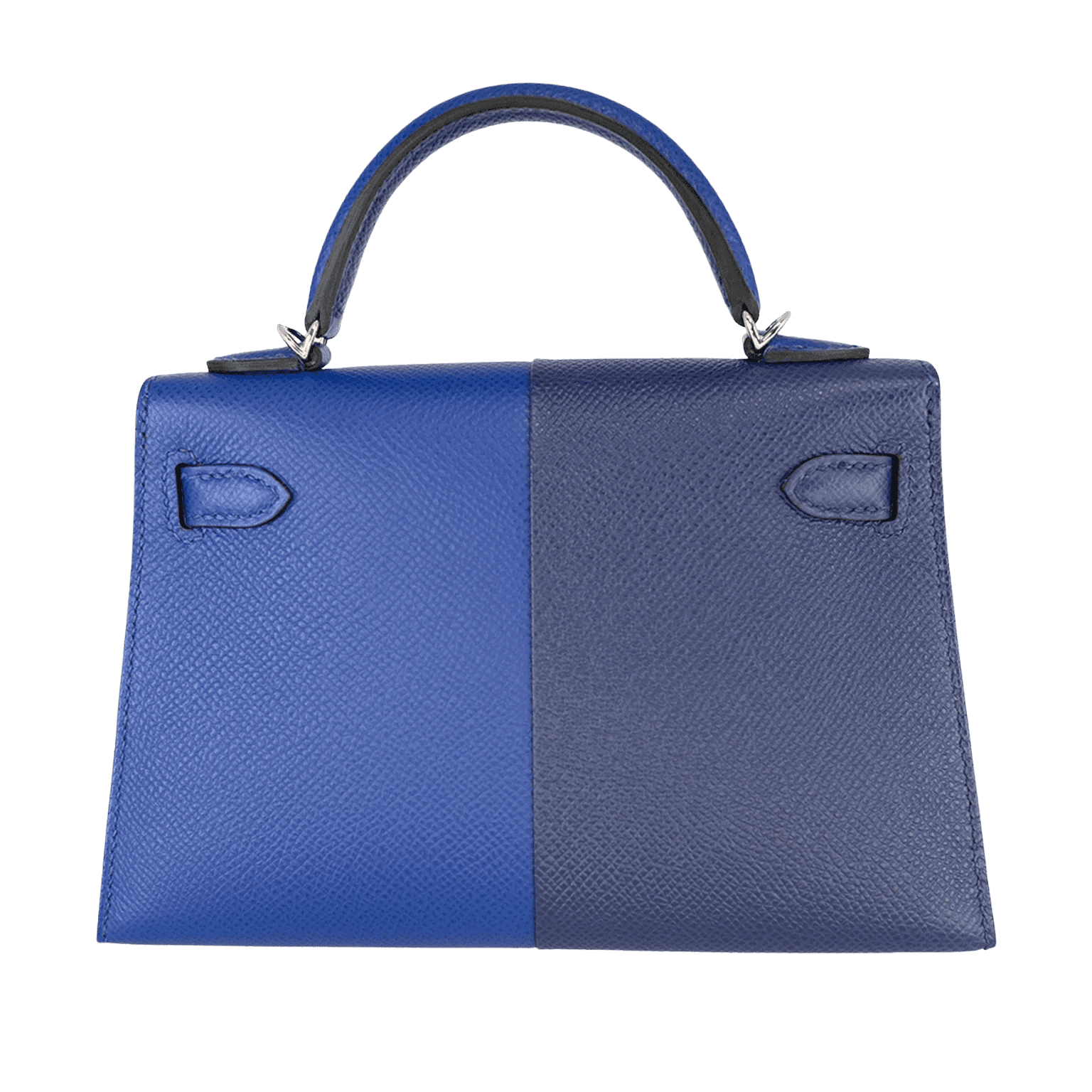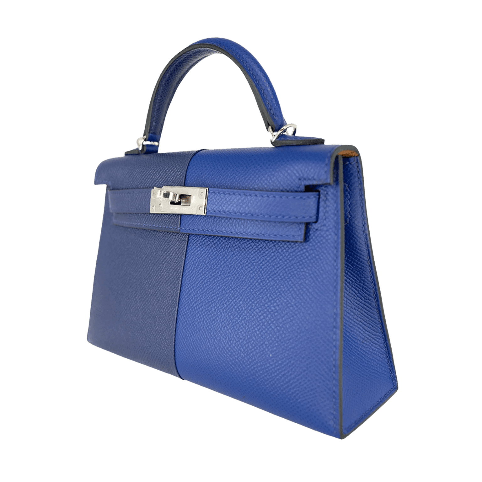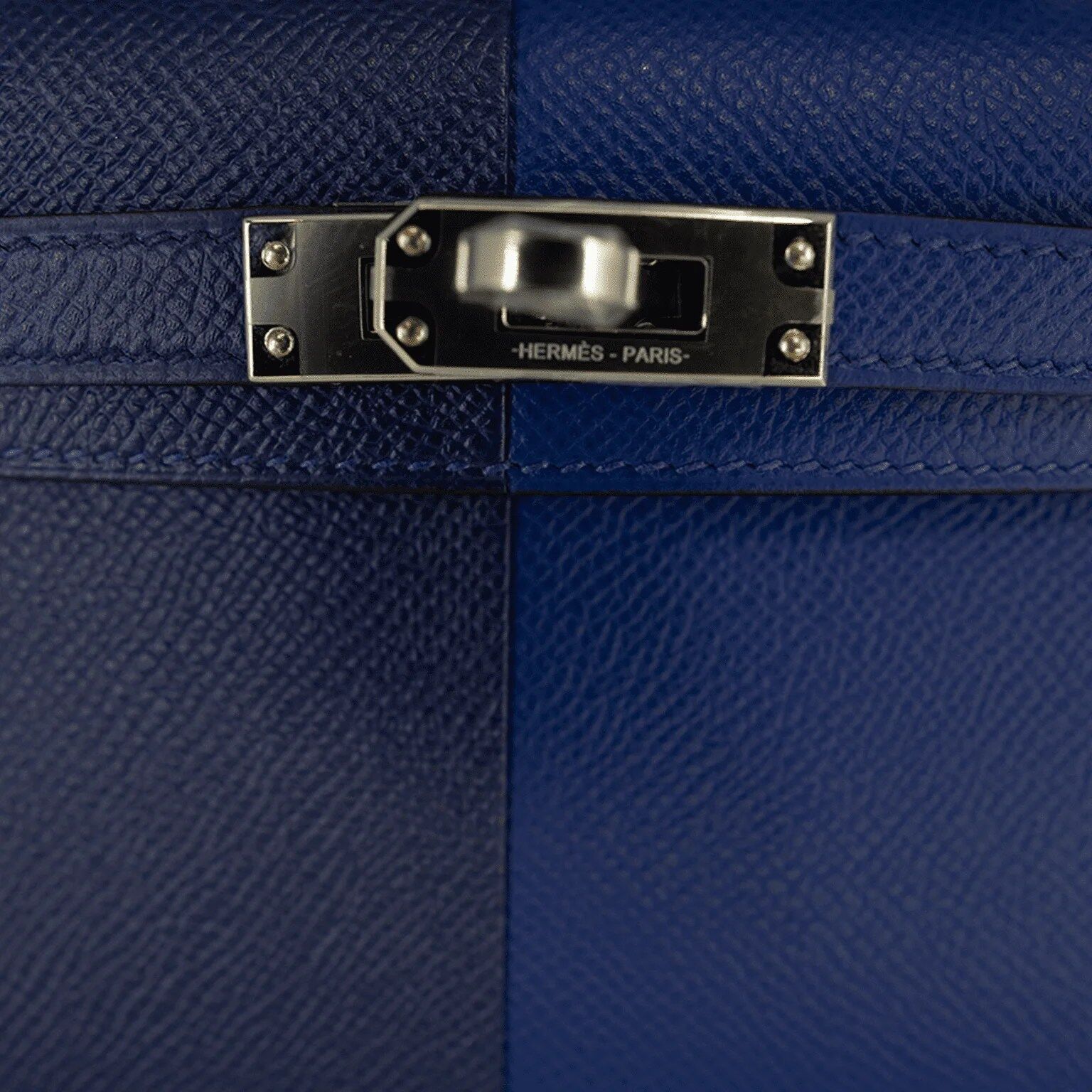 This authentic Hermès Special Edition Epsom Mini Kelly is pristine with the protective plastic intact on the hardware. Petite and feminine, the crossbody Kelly is very collectible in the 20 cm silhouette. Blue Electric and Blue Encre combine beautifully with Palladium hardware in this exquisite Mini Kelly.