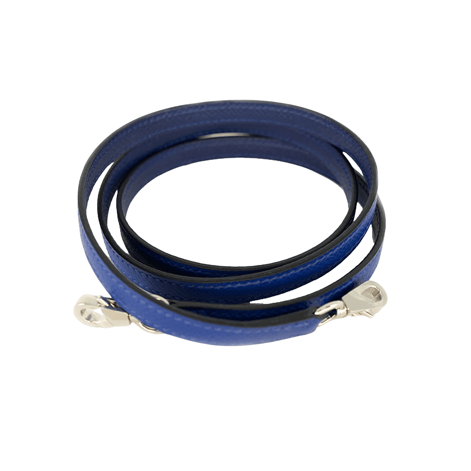 Serene blues in textured and durable Epsom leather. Chevre leather interior. Bright Palladium hardware accents. Carried by the top handle or with the optional strap. Shoulder strap and dust bag included. Made in France.