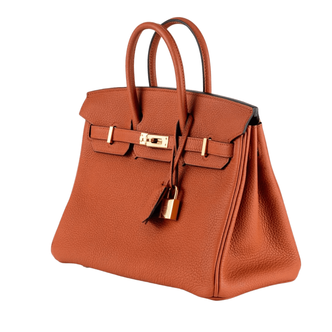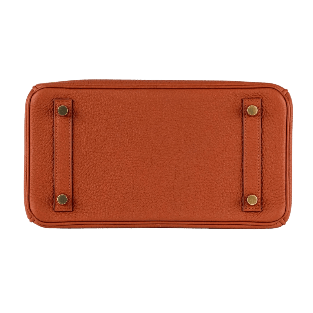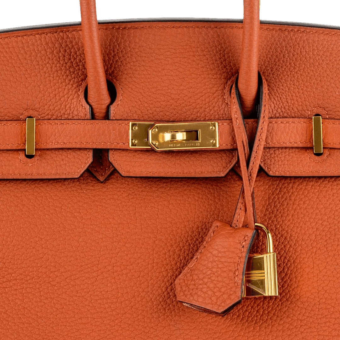 This authentic Hermès 25 cm Copper Togo Birkin is in pristine unworn condition. Hermès bags are considered the ultimate luxury item worldwide. Each piece is hand sewn with waitlists that exceed a year or more. In a striking orangey brown with gold hardware, the 25 cm Birkin is in extremely high demand.