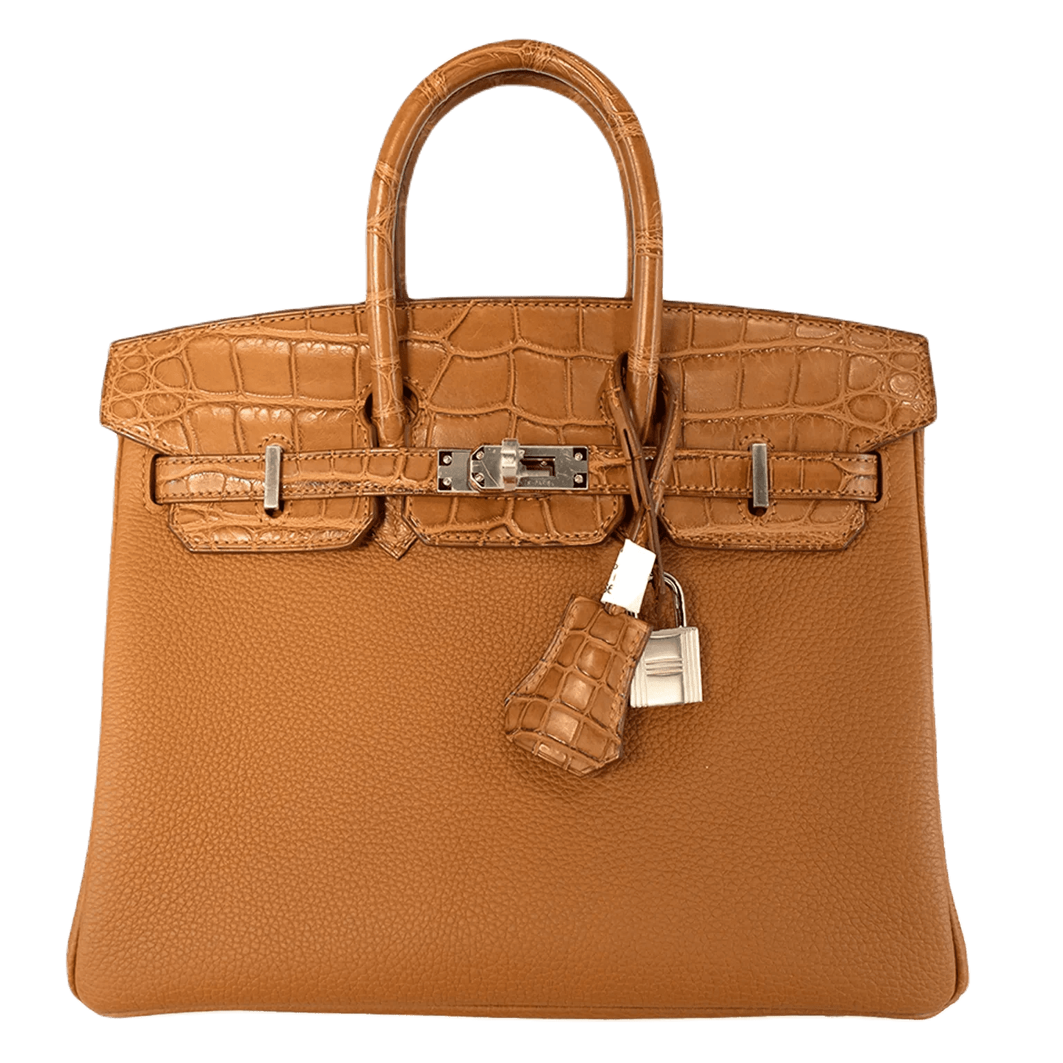 Sophisticated hardware beautifully enhances the matte crocodile finish on this demurely sized Birkin. Double rolled handles are carried in hand or at the elbow. Chevre (goat skin) lining with one side zippered pocket. Made in France.