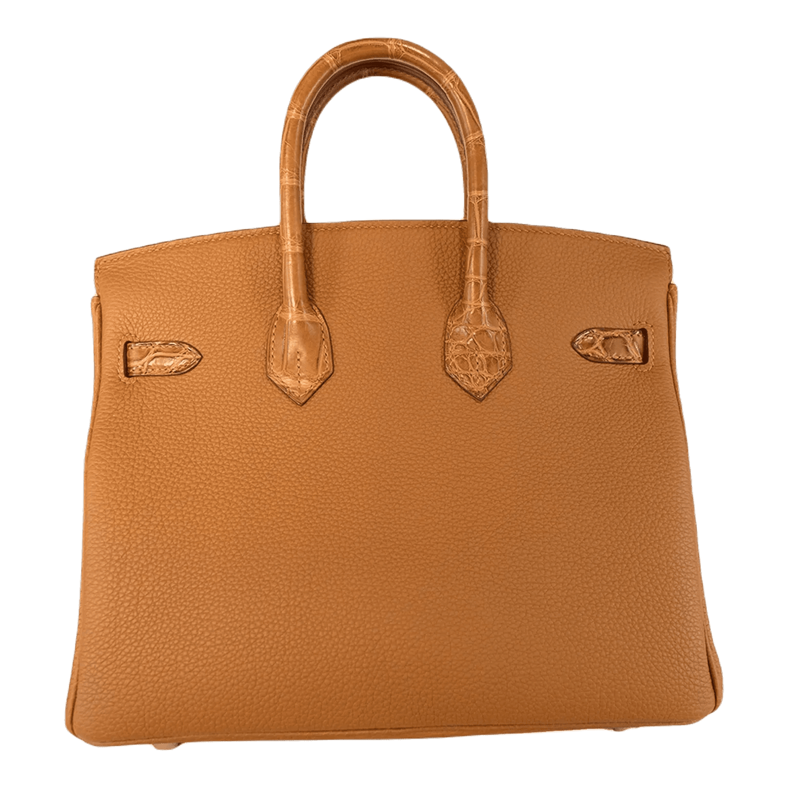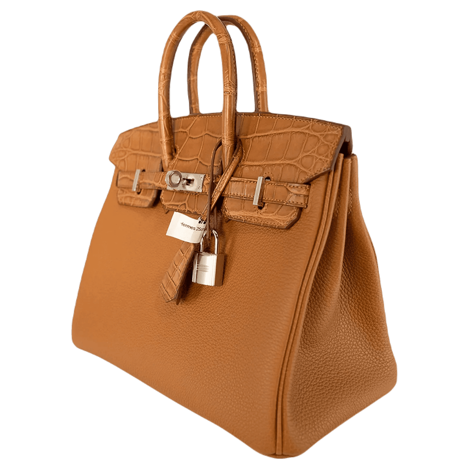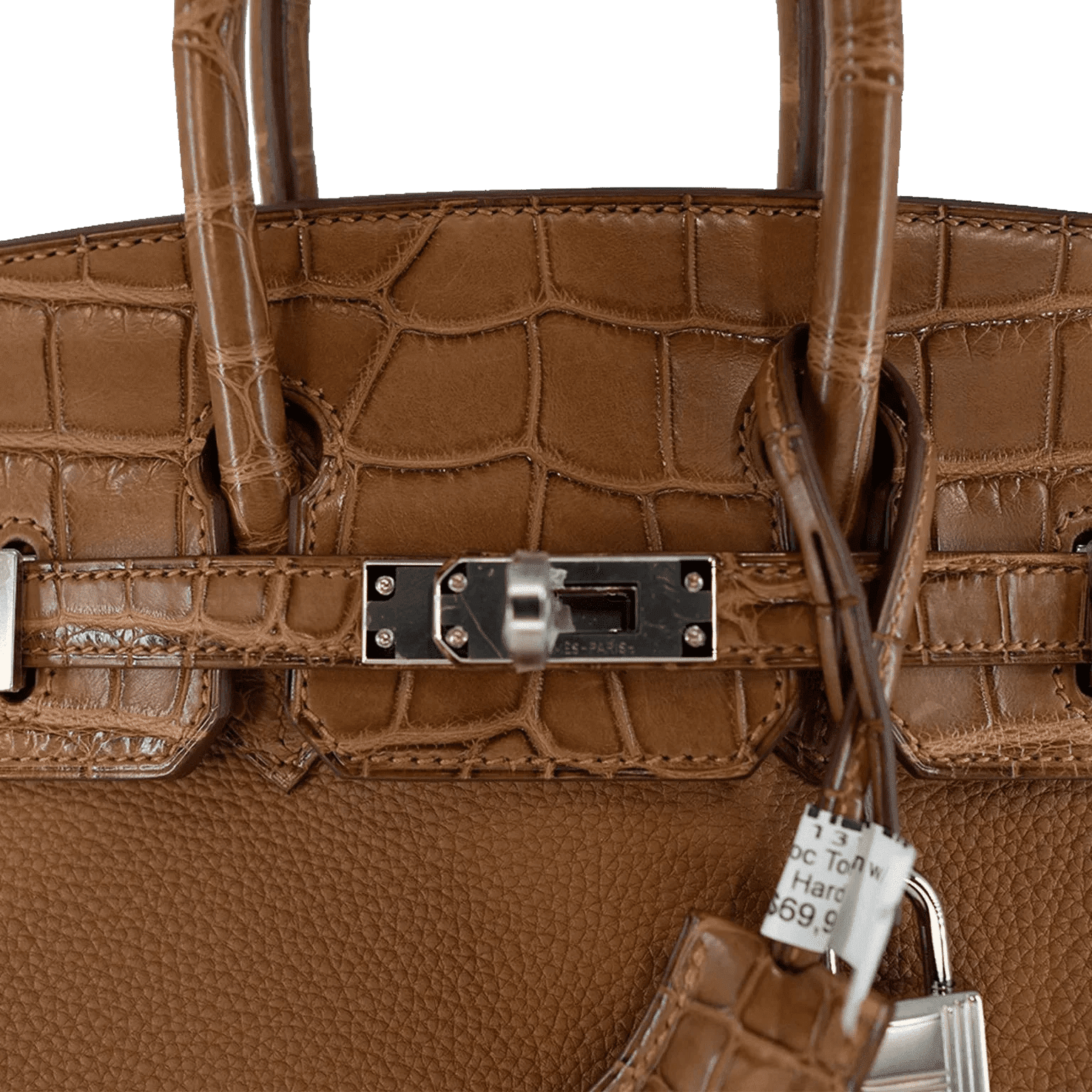 This authentic Hermès Gold Croc Touch 25 cm Birkin is in pristine unworn condition with the protective plastic intact on the hardware. Hand stitched by skilled craftsmen, wait lists of a year or more are common for the Hermès Birkin. The Croc Touch Birkin uniquely combines a durable Togo leather body with the exotic enhancement of a crocodile flap, handle and straps.