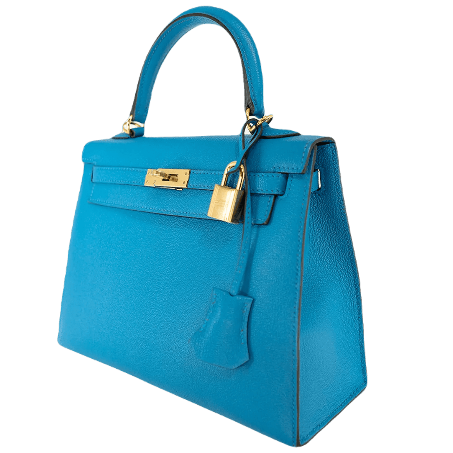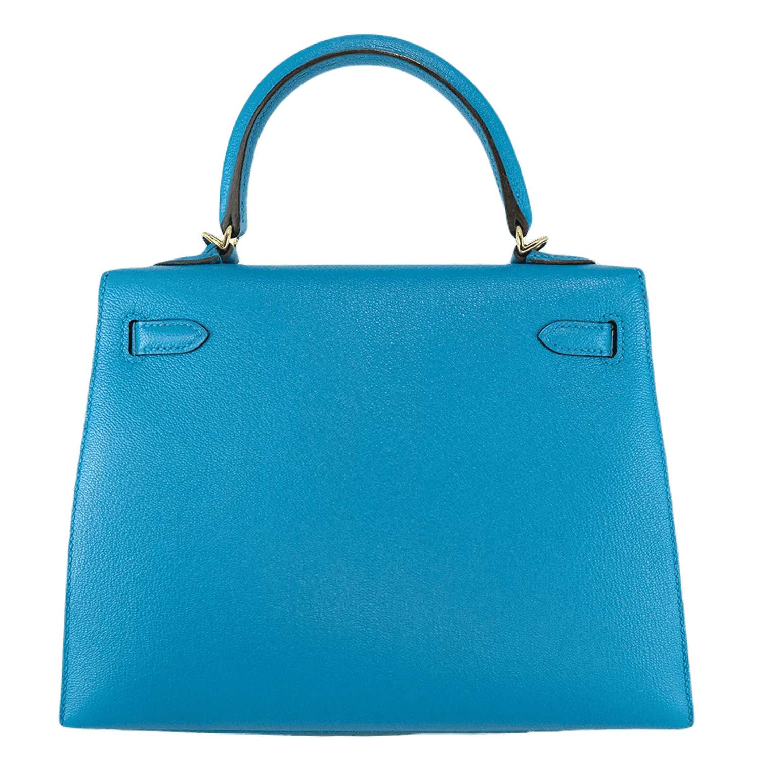 This authentic Hermès Turquoise Blue Chevre 25 cm Kelly is in pristine unworn condition with the protective plastic intact on the hardware. Perfectly scaled in the 25 cm silhouette, this demure Kelly easily holds a phone and other necessities.