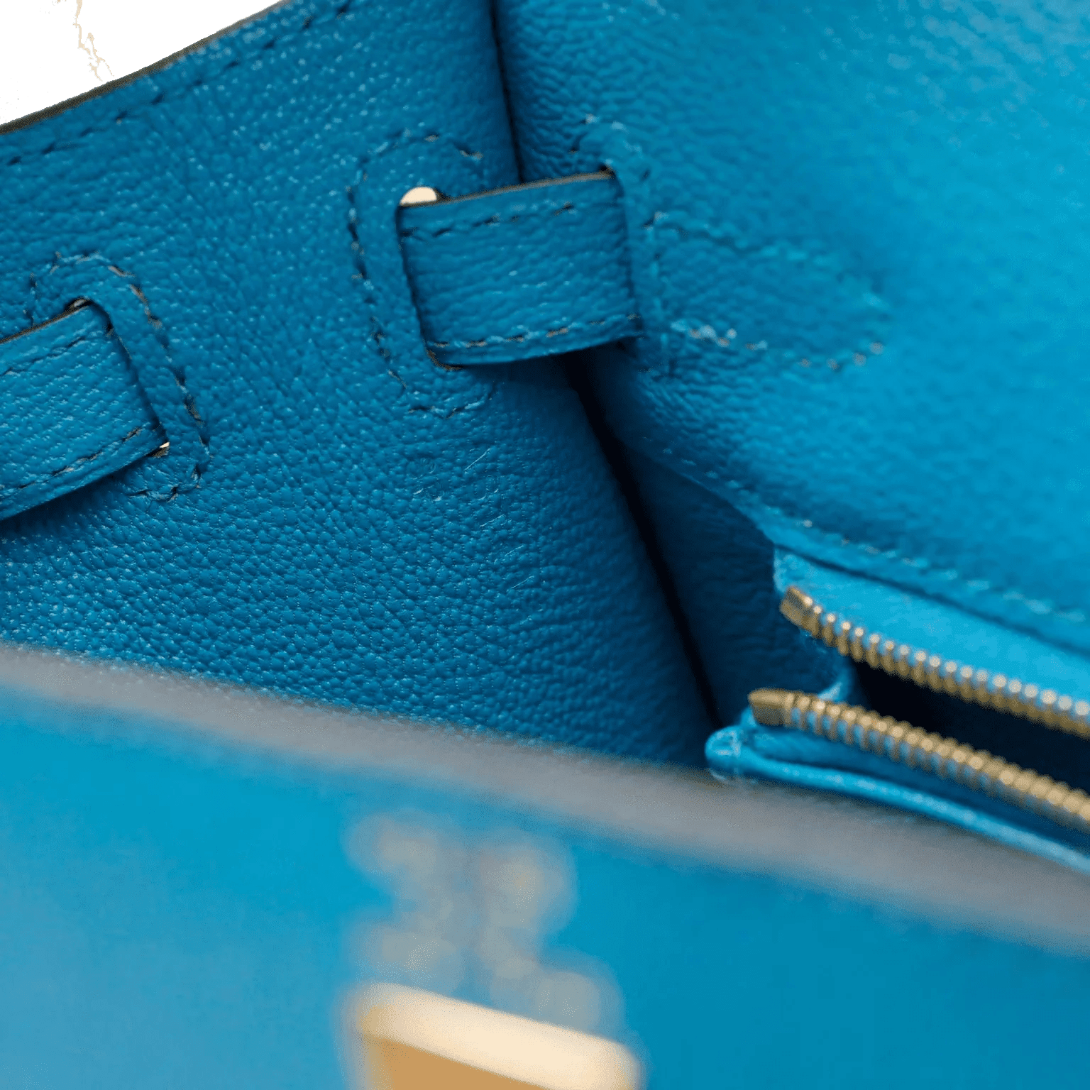 Turquoise blue chevre leather is extremely durable and desirable. Exquisitely accented with warm gold hardware. Carried by the top handle or with the optional strap. Padlock, keys, clochette, strap and dust bag included. A stamp. Made in France.