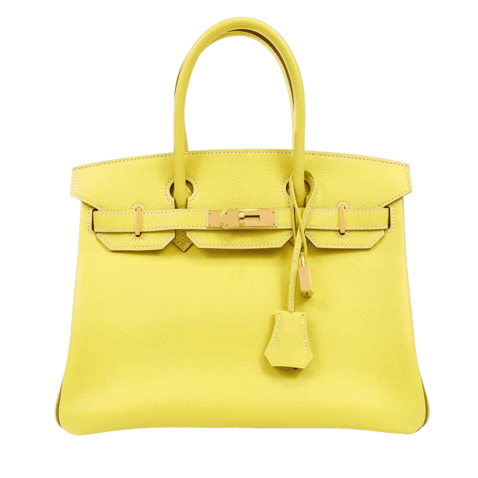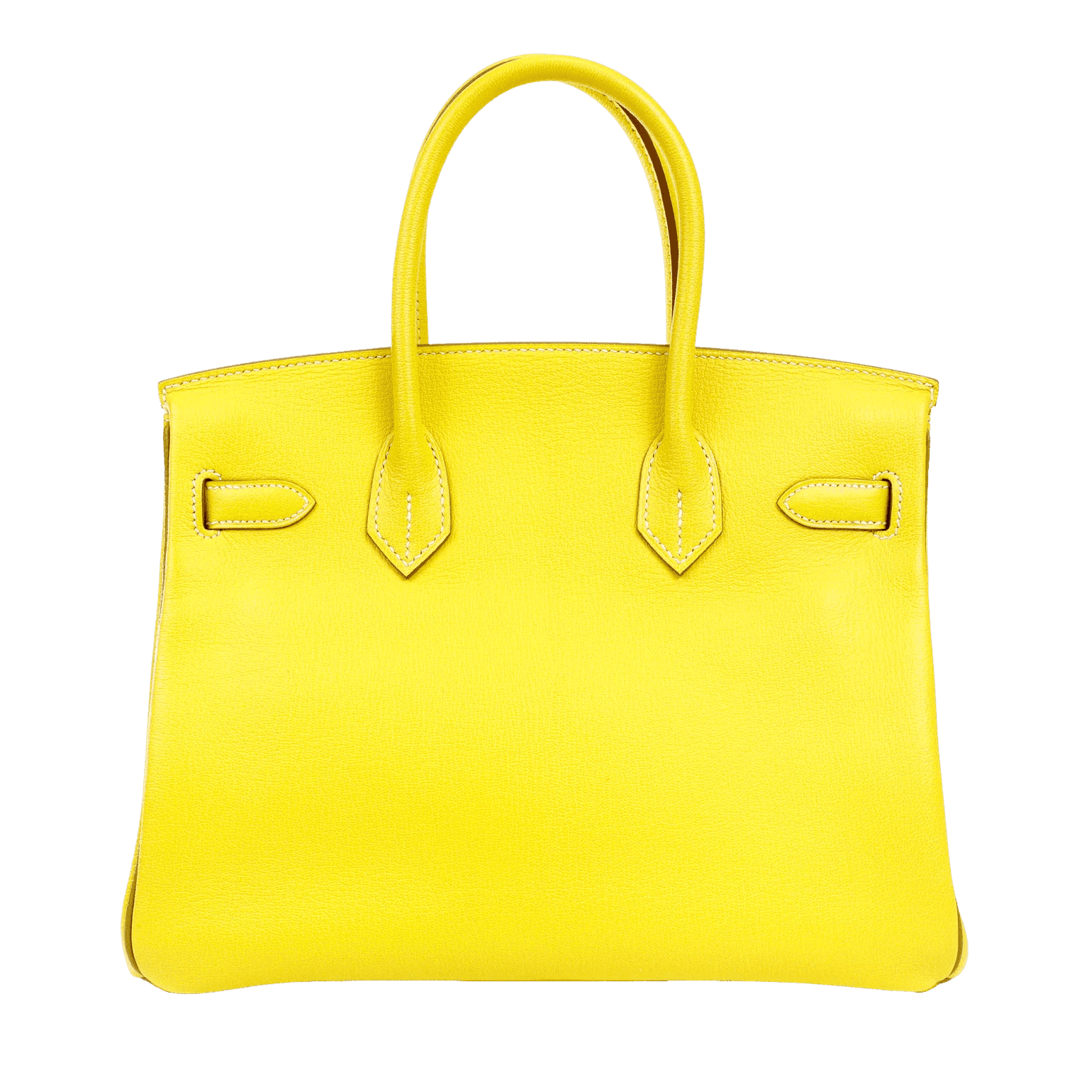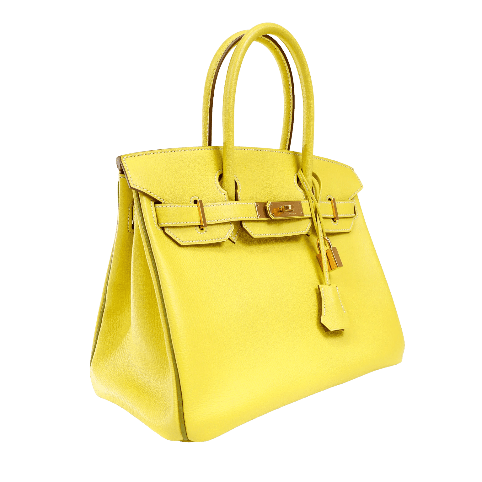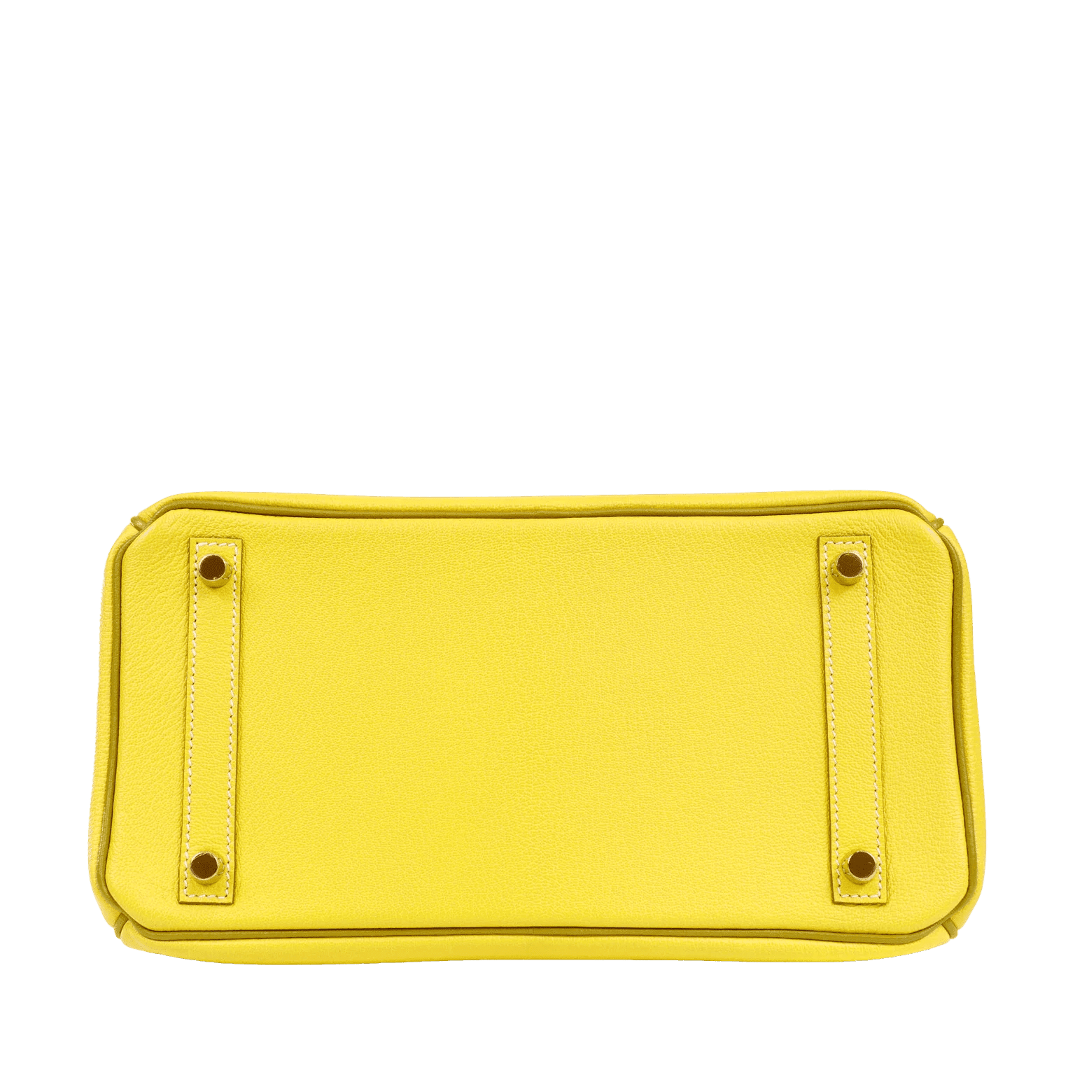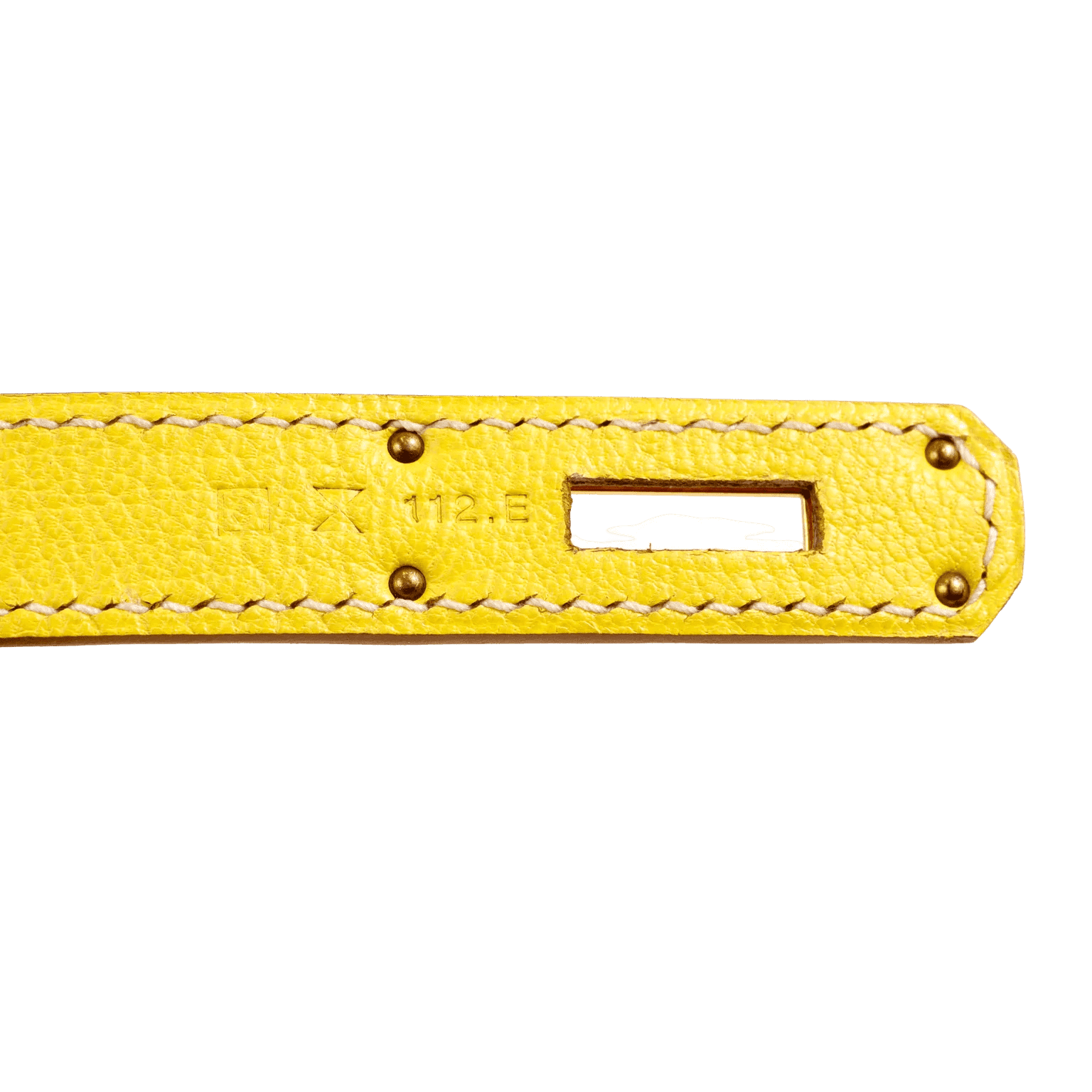 Chevre, or goat hide, has a textured appearance and is extremely resilient. Lightweight and durable, it also maintains the shape of the bag well over time. Warm gold hardware accents bright yellow beautifully. Vibrant yellow chevre (goat skin) lining with one side zippered pocket. Made in France. Purchase includes padlock, keys, clochette and dust bag.