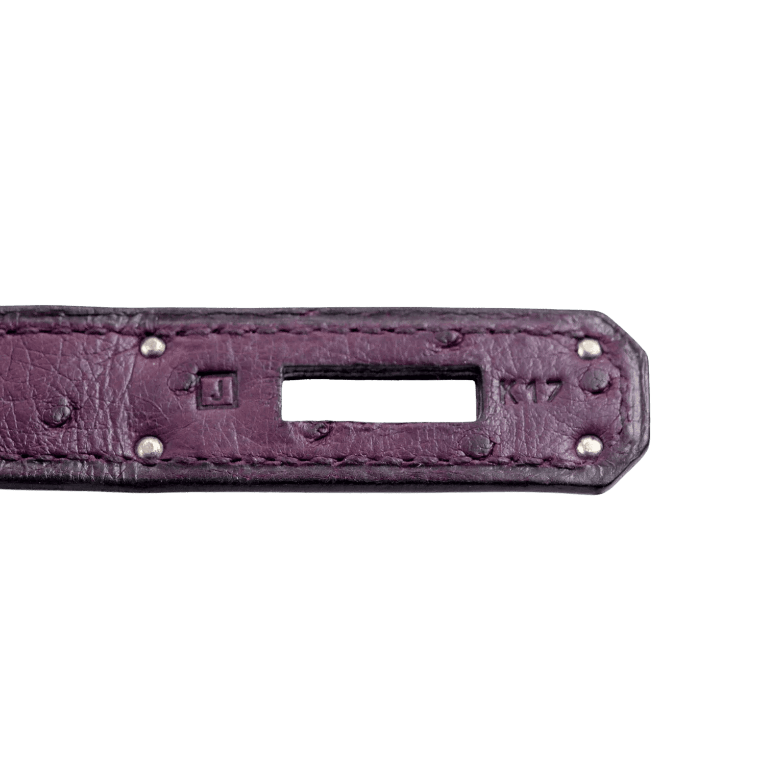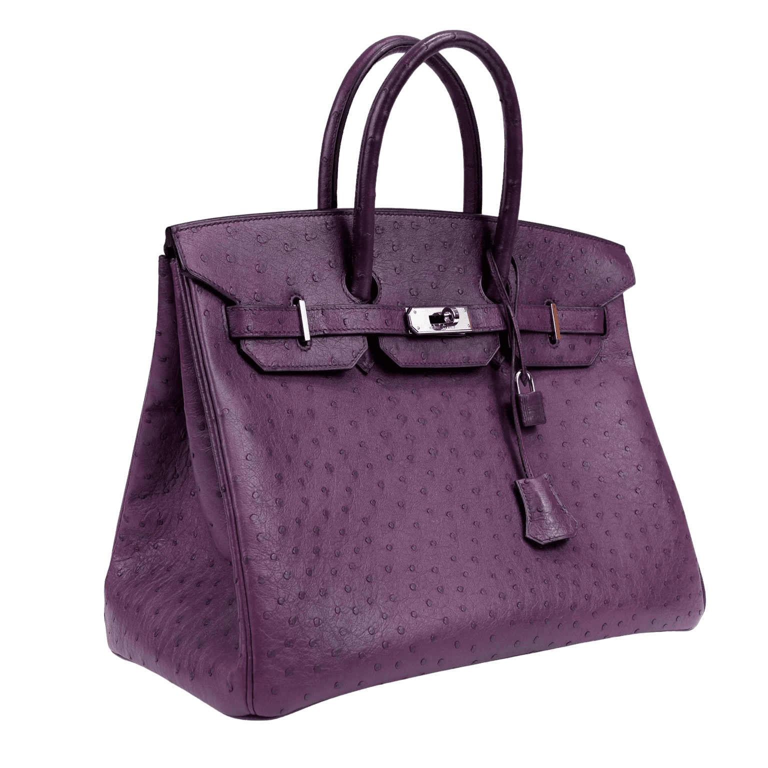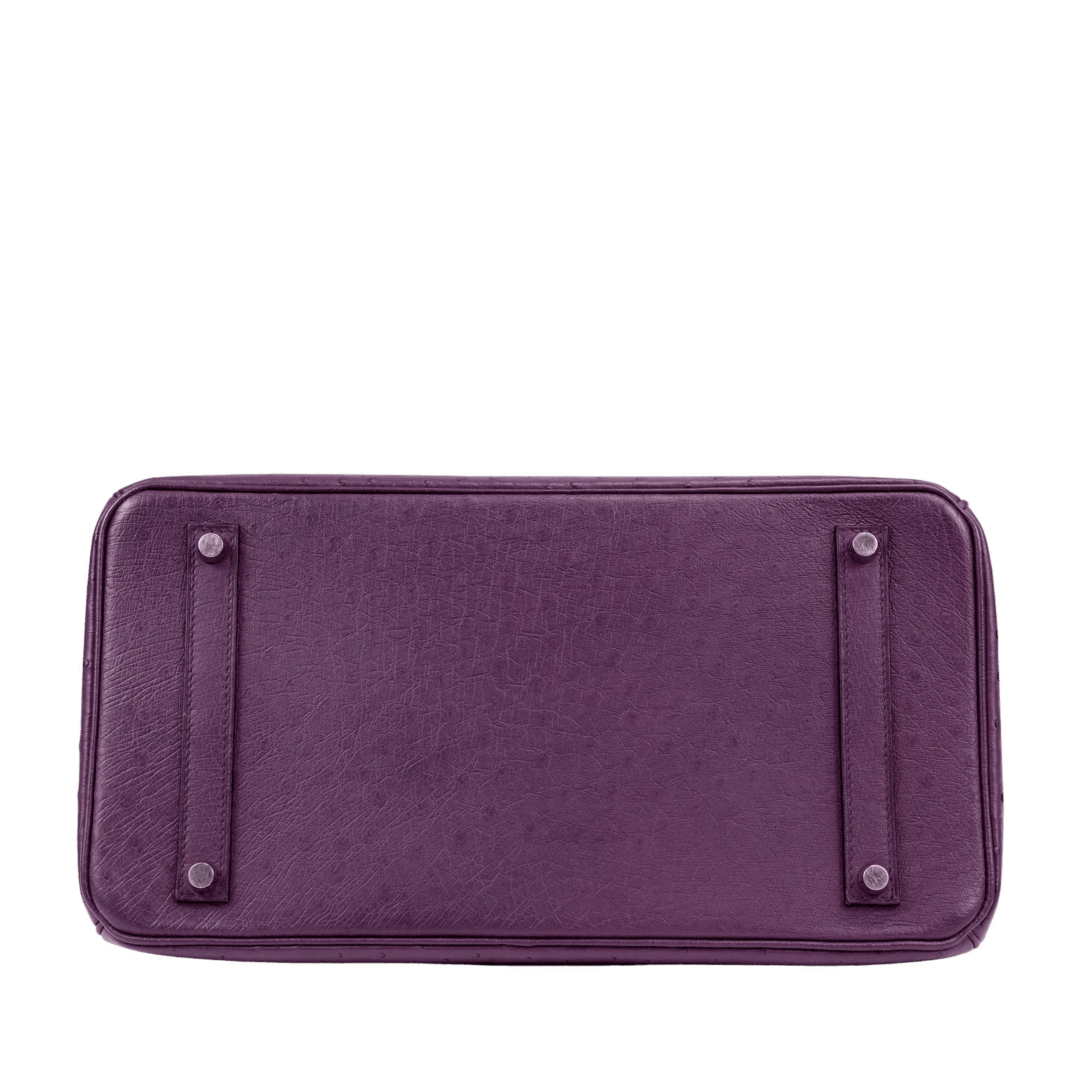 Hermès bags are considered the ultimate luxury item the world over. Hand stitched by skilled craftsmen, wait lists of a year or more are commonplace for the bovine versions. This particular Birkin is in Violet Ostrich skin with Palladium hardware; a rare exotic that is extremely difficult to find and a purple lover’s dream.