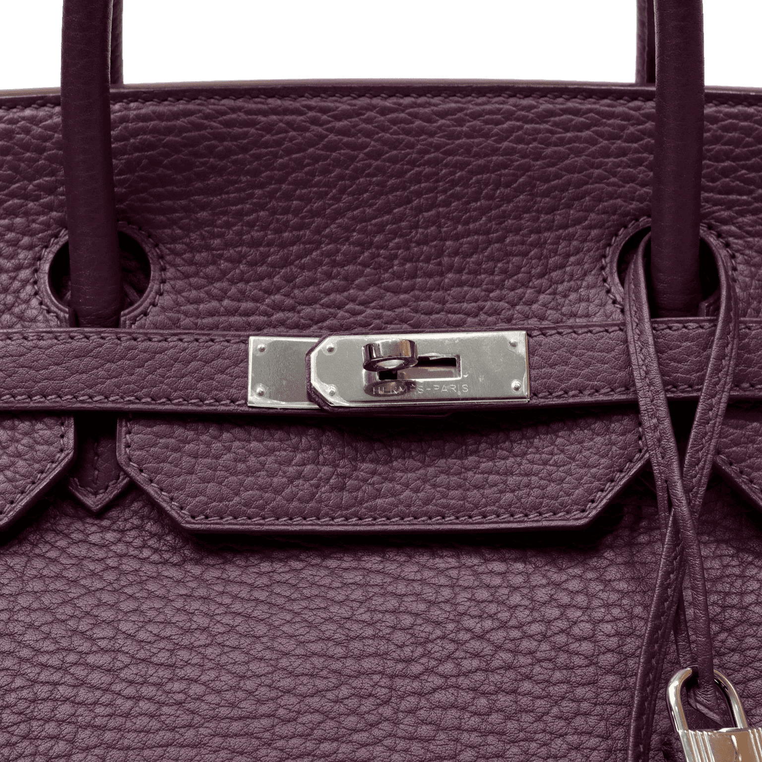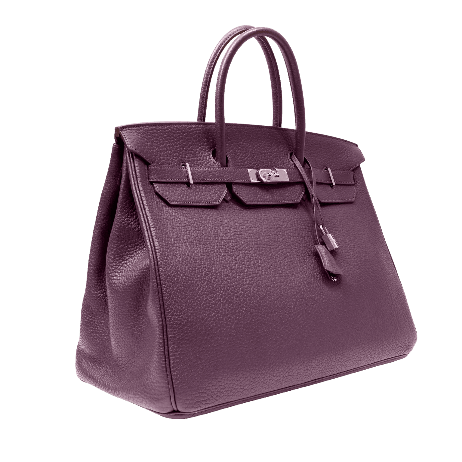 Fjord is a scratch resistant textured leather much like Togo or Clemence. Know for its lovely matte effect. Sophisticated Palladium hardware accents. Double rolled handles are carried in hand or at the elbow. Violet chevre (goat skin) lining with one side zippered pocket. O stamped within a square. Made in France. Purchase includes padlock, keys, clochette and dust bag.