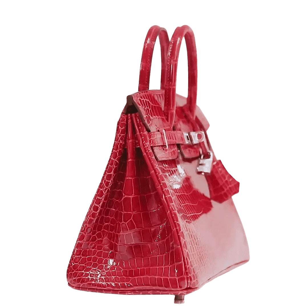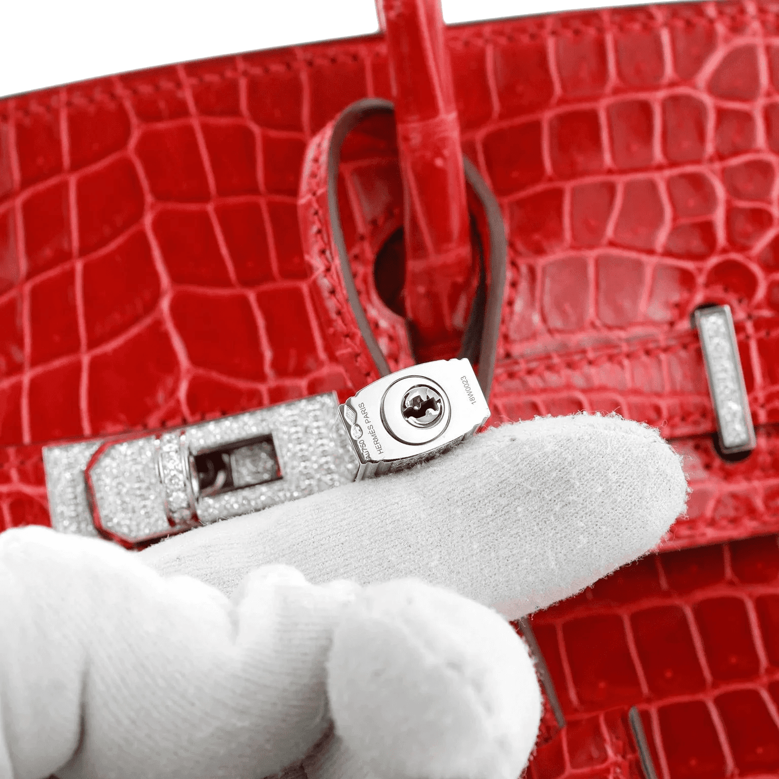 Red shiny crocodile skin showcases every detail beautifully. Diamond encrusted Palladium clasp and padlock are the epitome of luxury. Double handles are carried in hand or at the elbow. Chevre (goat skin) lining with one side zippered pocket. Made in France. Purchase includes padlock, key, clochette and dust bags.
