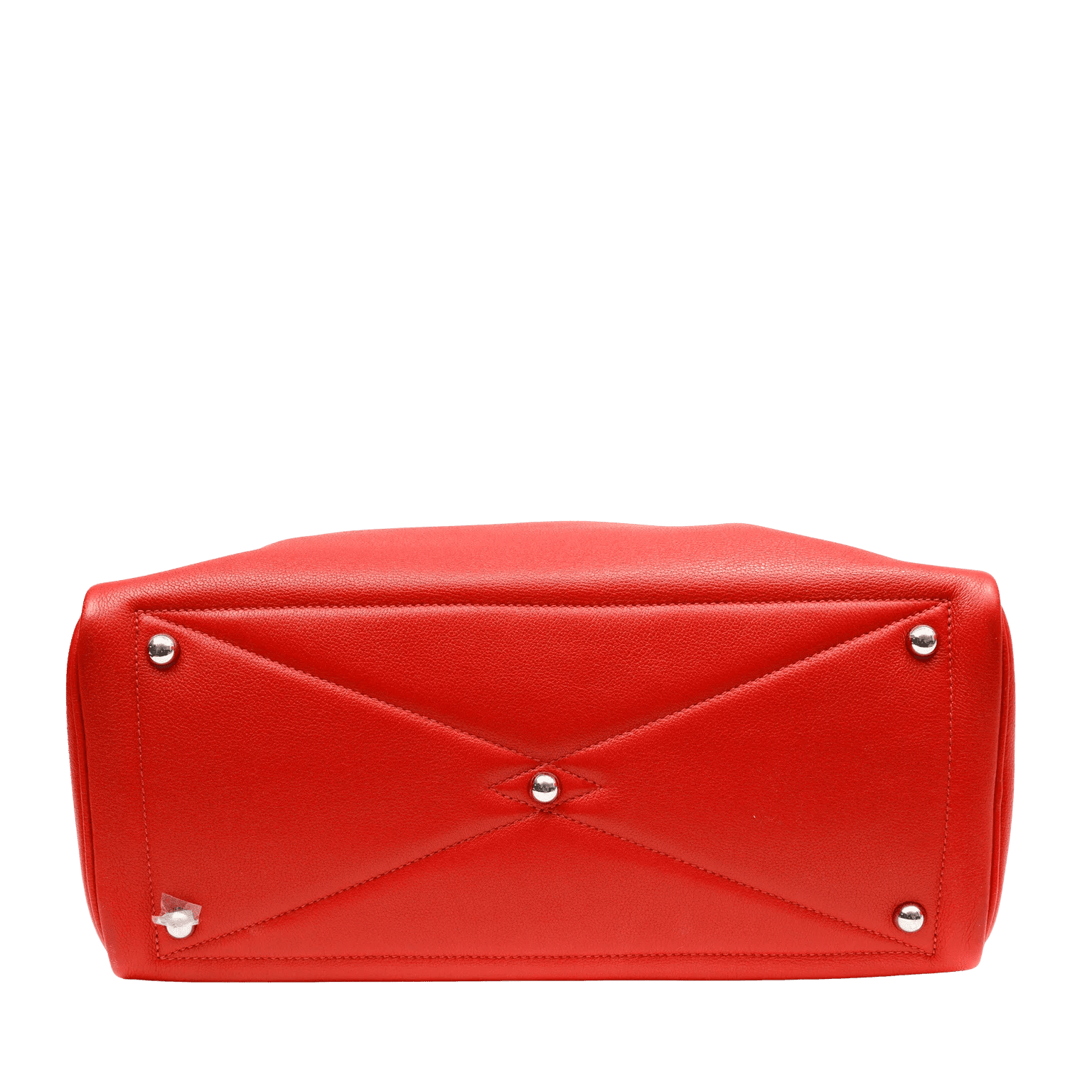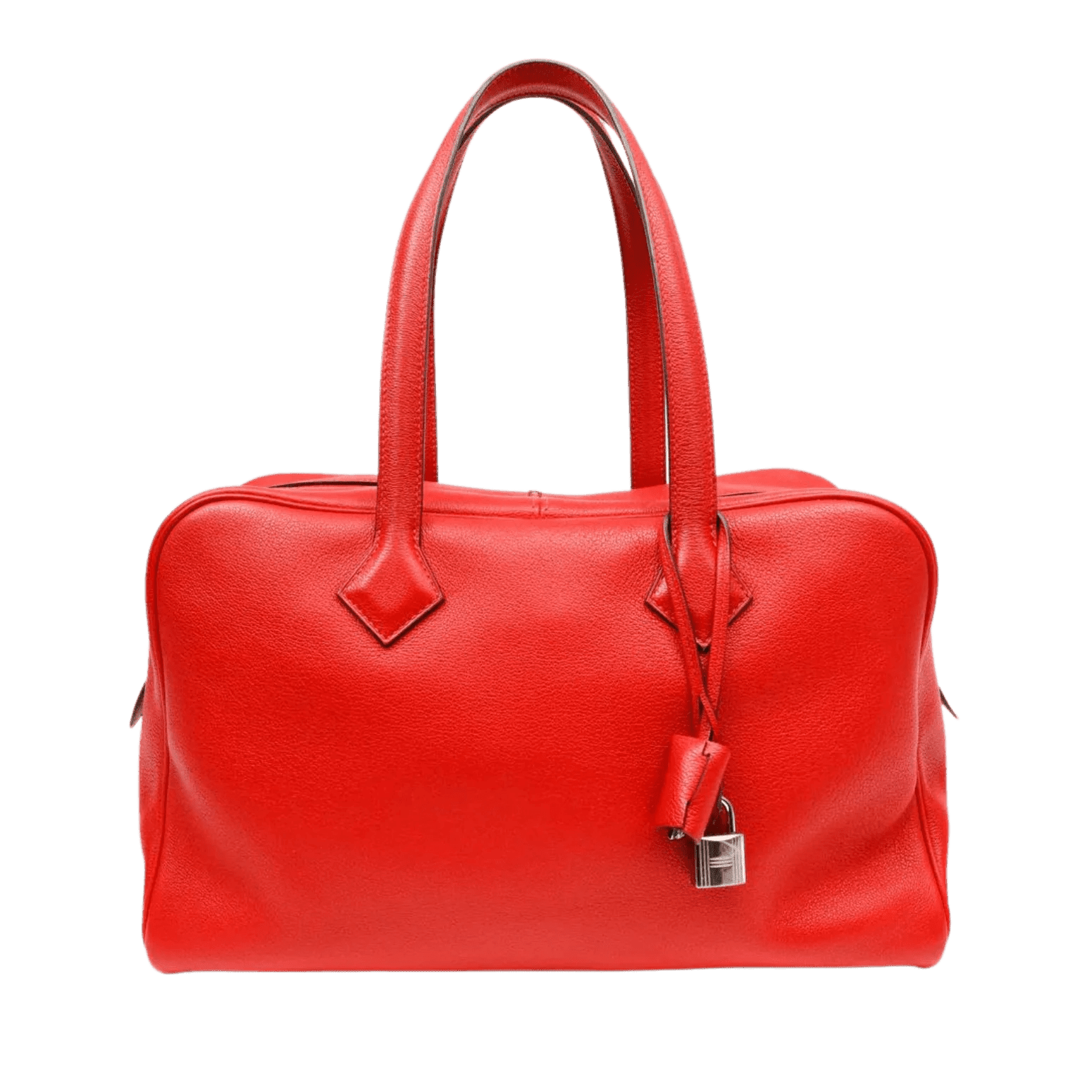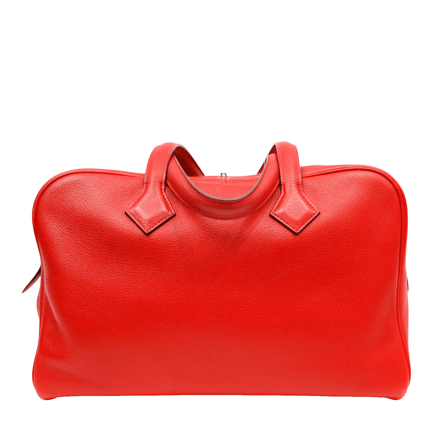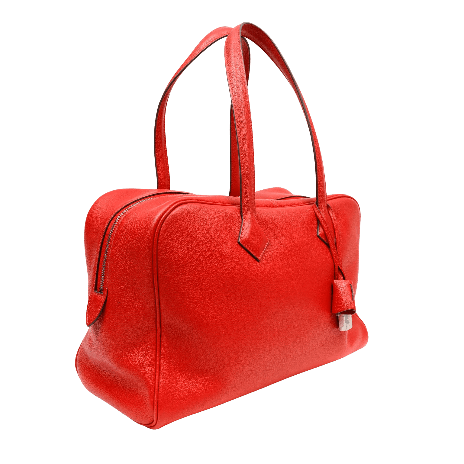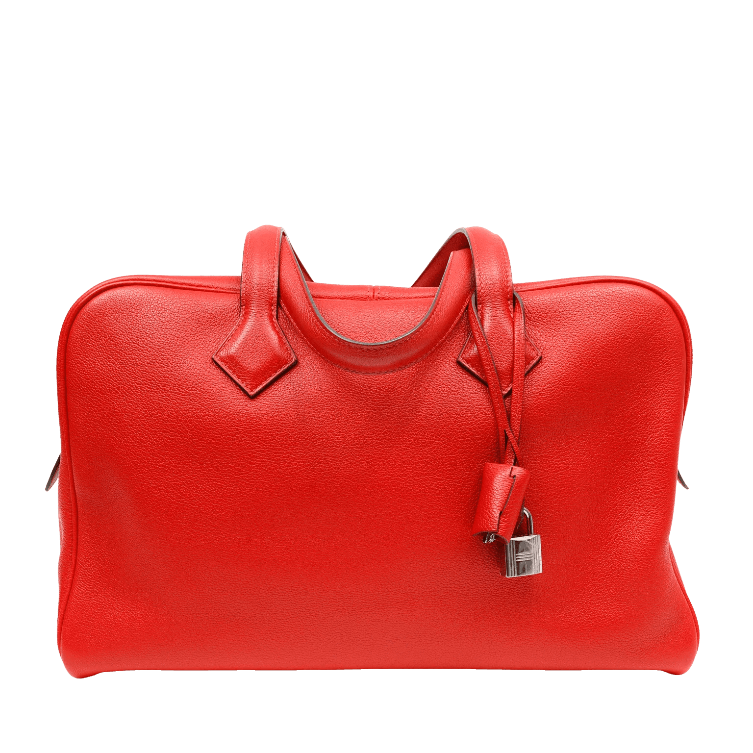This authentic Hermès Red Clemence Victoria II Bag is in excellent plus condition. The relaxed silhouette is roomy and soft to the hand in textured lipstick red Clemence leather. Two-way double zip closure accesses the canvas interior. Palladium hardware accents. Double straps are comfortably carried on the shoulder. Padlock, clochette, and dust bag included. Made in France.